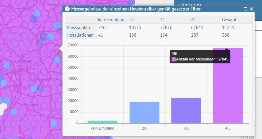 Die Karte lässt sich nach einigen Kriterien filtern, sodass sich ein interessantes Bild ergeben kann. Filtert man etwa nach Netzbetreiber, ergeben sich teilweise sehr unterschiedliche Bilder. Zumindest laut dieser Karte lässt sich sagen, dass die Telekom das beste Mobilfunknetz hat – aber das ist trotz anonymer Messung ein subjektiver Wert. Mehr dazu im nächsten Absatz. Außerdem lässt sich die Karte nach Zeitraum sowie dem verwendeten Standard filtern – dieser reicht von Kein Empfang bis zu 4G.