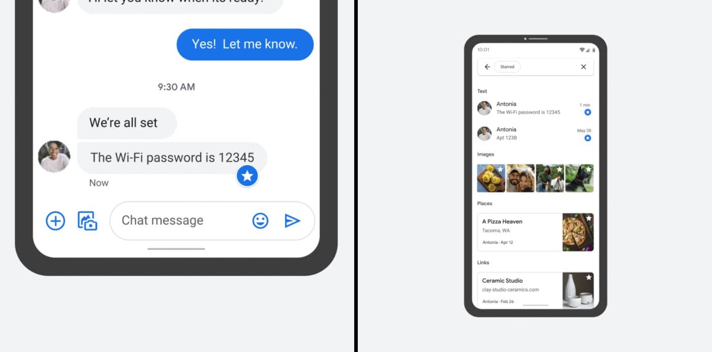 Google Messages legt auch beim Funktionsumfang zu und bietet nun die Möglichkeit, einzelne Nachrichten aus einer Konversation mit einem Stern zu versehen und damit zu favorisieren. So können sie sehr schnell über einen kleinen Indikator im Chat wiedergefunden werden. Außerdem gibt es einen neuen Bereich, in dem alle favorisierten Nachrichten aufgelistet werden. Beides sollte hoffentlich dabei helfen, ein solches Feature sichtbarer und praktischer zu gestalten als es etwa bei WhatsApp der Fall ist, wo dies recht gut versteckt ist.
