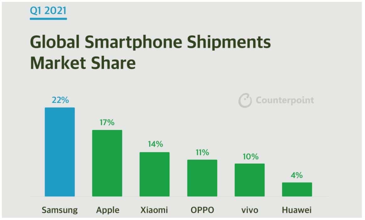 Der Smartphone-Markt ist nach einigen müden Jahren wieder in Bewegung und erlebt nicht nur ein ständiges Auf und Ab, sondern auch einen Wechsel an den Spitzenpositionen: Im 1. Quartal 2021 findet sich wenig überraschend Samsung an der Spitze der größten Smartphone-Hersteller, doch viel interessanter wird ein Blick in die etwas weiter hinten gelegenen Ränge: Huawei hat weltweit, selbst im Heimatmarkt, einen beispiellosen Absturz hinter sich.