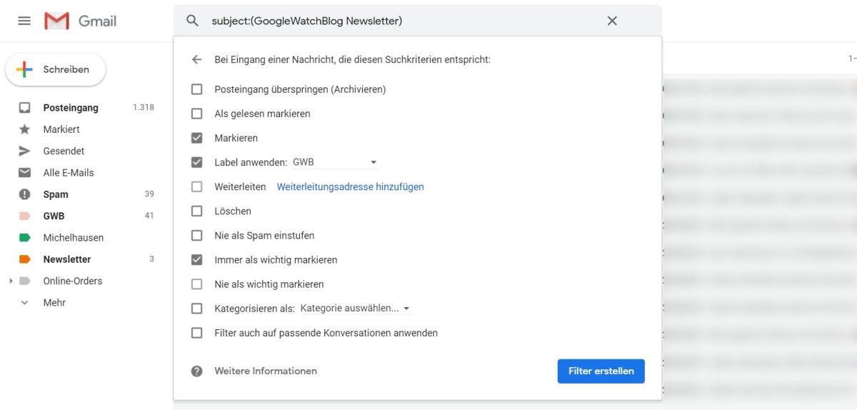 Seid ihr euch nicht sicher, ob die Kriterien passen, dann führt die Suche durch und schaut euch das Ergebnis an. Passt es, klickt erneut auf den Pfeil im Suchfeld und dann erst auf „Filter erstellen“. Ansonsten einfach mehr oder weniger Kriterien eingeben.