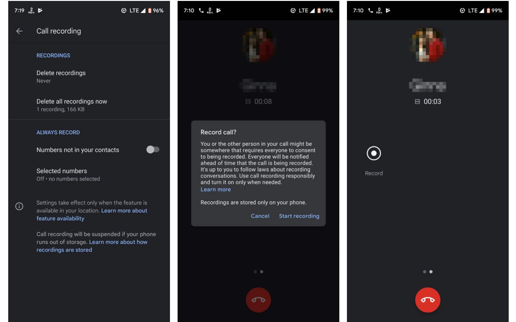Abgezeichnet hat sich diese Funktion schon seit einem Teardown im Januar und nun wird es ausgerollt. Nach dem Aufbau eines Telefonats erscheint ein Aufnehmen-Button in der Standardansicht, der nach einer etwas längeren Warnmeldung die Aufzeichnung startet. Bis man sich das beim ersten Mal durchgelesen hat, hat das Gegenüber vermutlich schon aufgelegt – aber natürlich müssen die Regeln ja an irgendeiner Stelle eindeutig erklärt werden. Auf obigen Screenshots könnt ihr sehen, wie das derzeit umgesetzt ist.