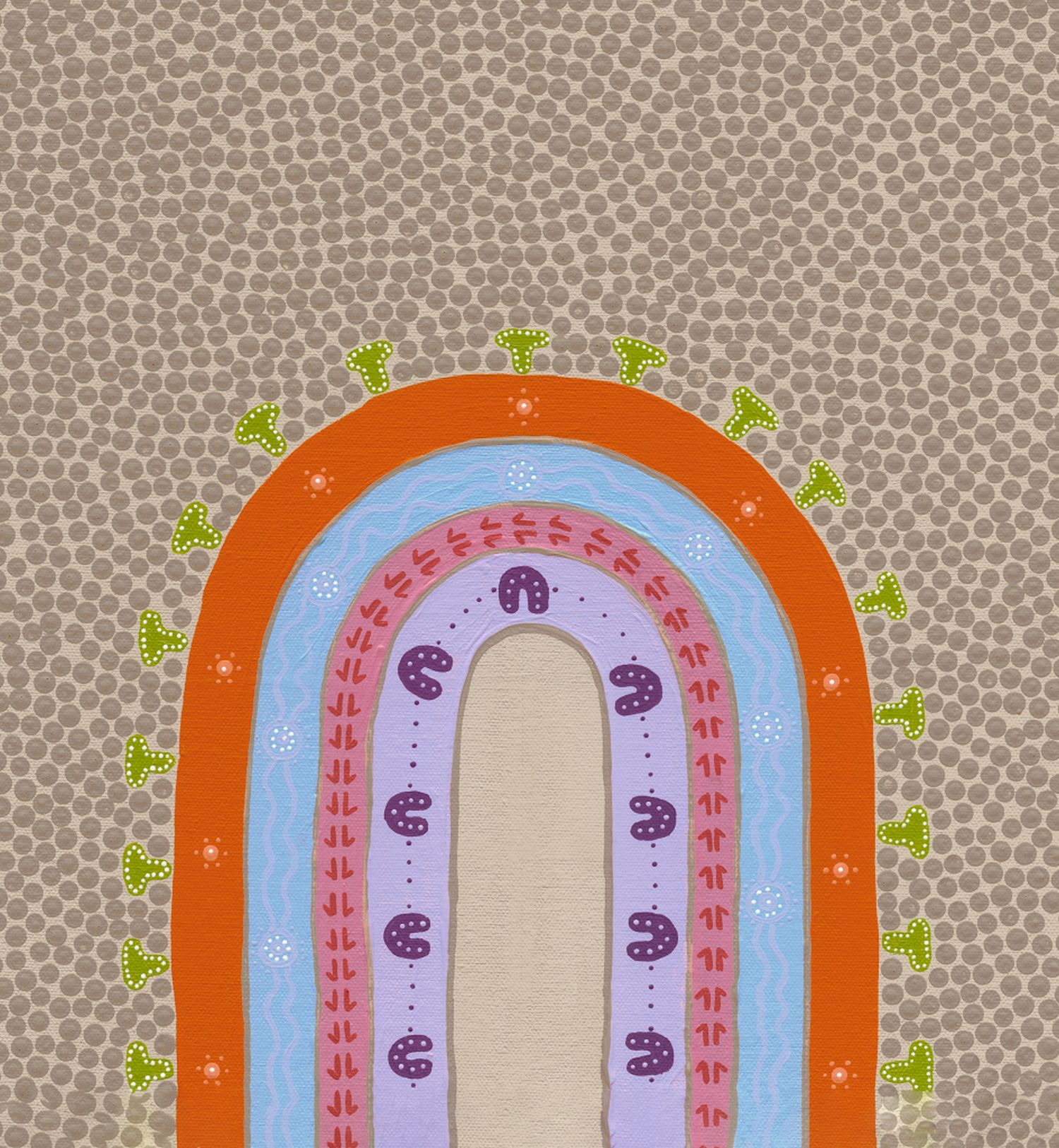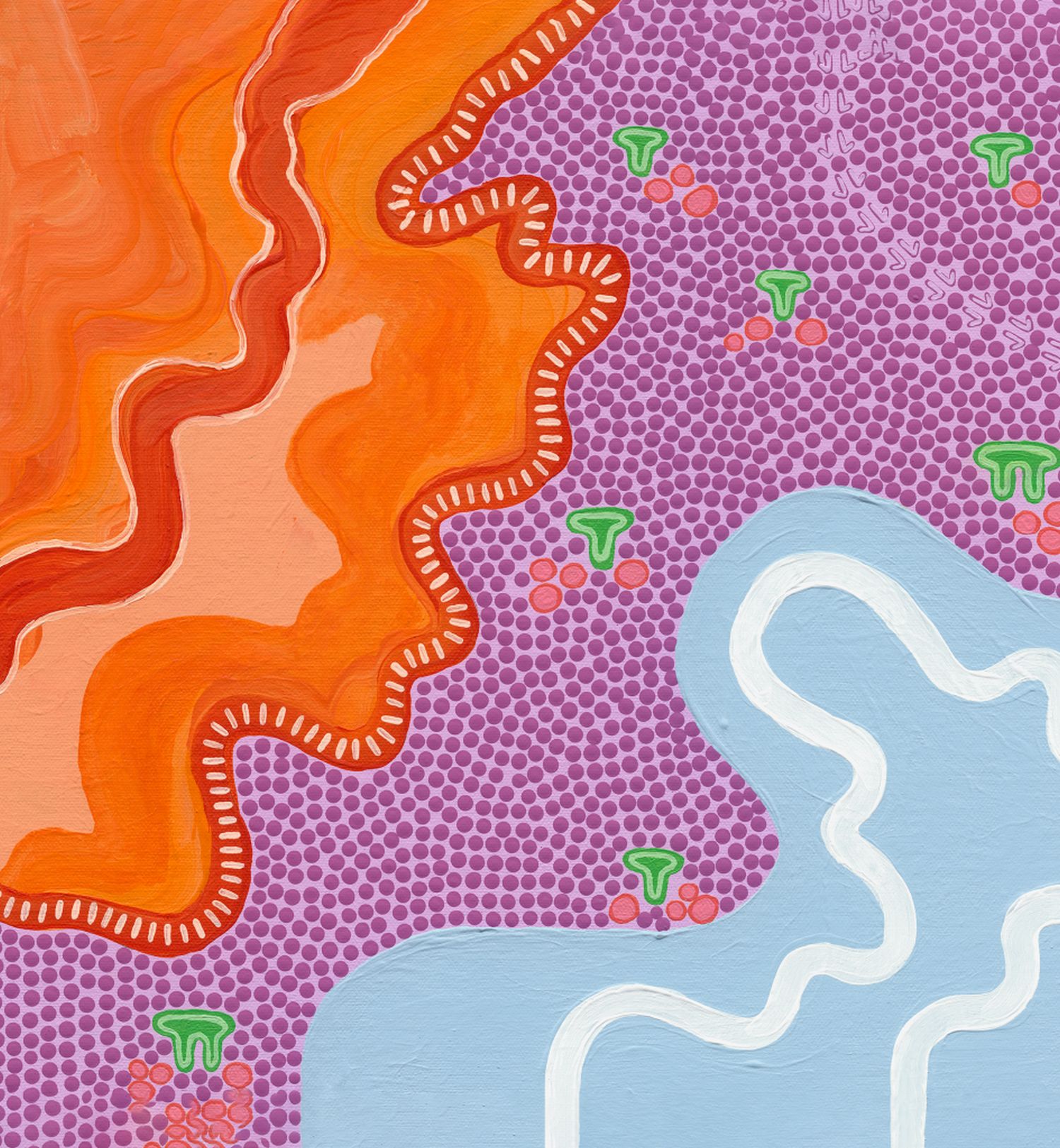 - Elements: Coexisting on country. This piece reflects People, Kangaroo Tracks, Water, Fire and Earth. All coexisting.