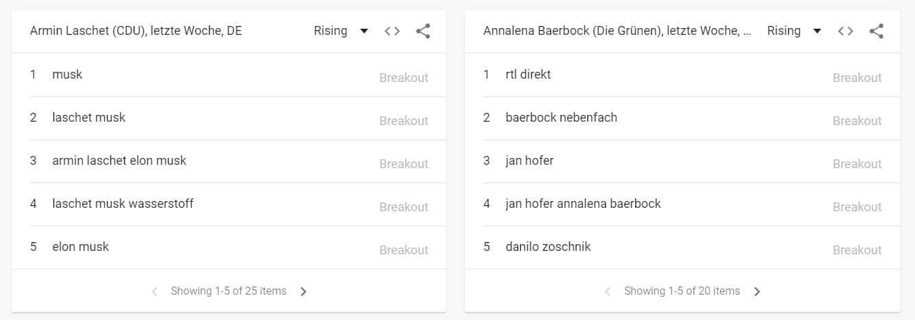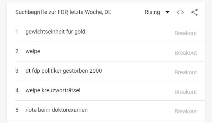 Teilweise lassen sich die Daten filtern und nach Toplisten oder Aufsteigend nach zunehmenden Interesse sortieren. Die dargestellten Top 5-Anfragen lassen sich außerdem blättern, sodass ihr 20 weitere (oder noch mehr) Suchanfragen aus den jeweiligen Kategorien abrufen könnt. Schaut euch das Portal einfach einmal an.