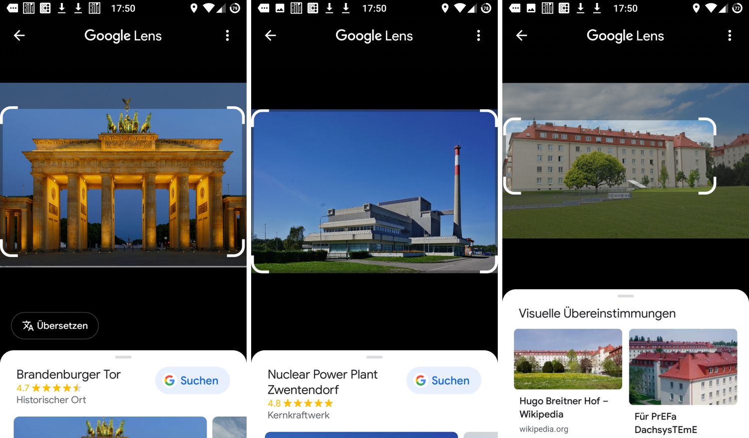 Nutzt ihr die Gebäudeerkennung von Google Lens, die entweder über den Schieberegler im Sucher ausgewählt oder auch automatisch gestartet werden kann, wird das abgebildete Bauwerk im besten Fall erkannt, betitelt und mit einer Reihe von relevanten Suchergebnissen oder weiteren Bildern versehen. Auf obigen Screenshots könnt ihr sehen, wie das funktioniert und wie ein solches Ergebnis aussieht. Im Normalfall erkennt Lens, dass ihr das Gebäude scannen möchtet, sodass ihr den Modus nicht aufrufen müsst.