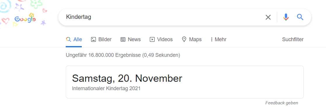Das Doodle ist generisch und wird weltweit für alle Kindertage im selben Jahr verwendet, sodass es dem einen oder anderen vielleicht schon bekannt vorkommen dürfte. Interessant ist heute der Knowledge Graph-Eintrag für die Suchanfrage „Kindertag“. Dort wird angegeben, dass der Tag am 20. November 2021 zelebriert wird. Das liegt an den weltweit verschiedenen Daten, sollte in der deutschen Sprache dann aber doch korrekt angegeben werden. Noch ein Detail: Im vergangenen Jahr hat Google das Doodle in Deutschland am 1. Juni geschaltet.