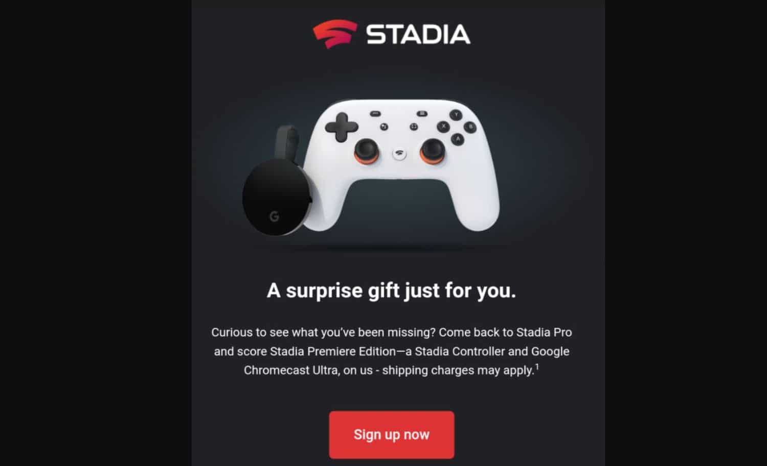 Einige UK-Nutzer haben in den vergangenen Tagen eine E-Mail mit obigem Inhalt erhalten. Dort wird ihnen angeboten, auf die Spieleplattform zurückzukehren (Sprich: mindestens einen Monat Pro zu zahlen) und anschließend ein Stadia Premiere Kit Starterset kostenlos zu erhalten. Ein sehr schönes Angebot, allerdings sollten gerade die sehr frühen Tester allesamt bereits ein solches Paket besitzen. Chromecasts und Controller kann man nie genug haben, aber dennoch etwas merkwürdig.