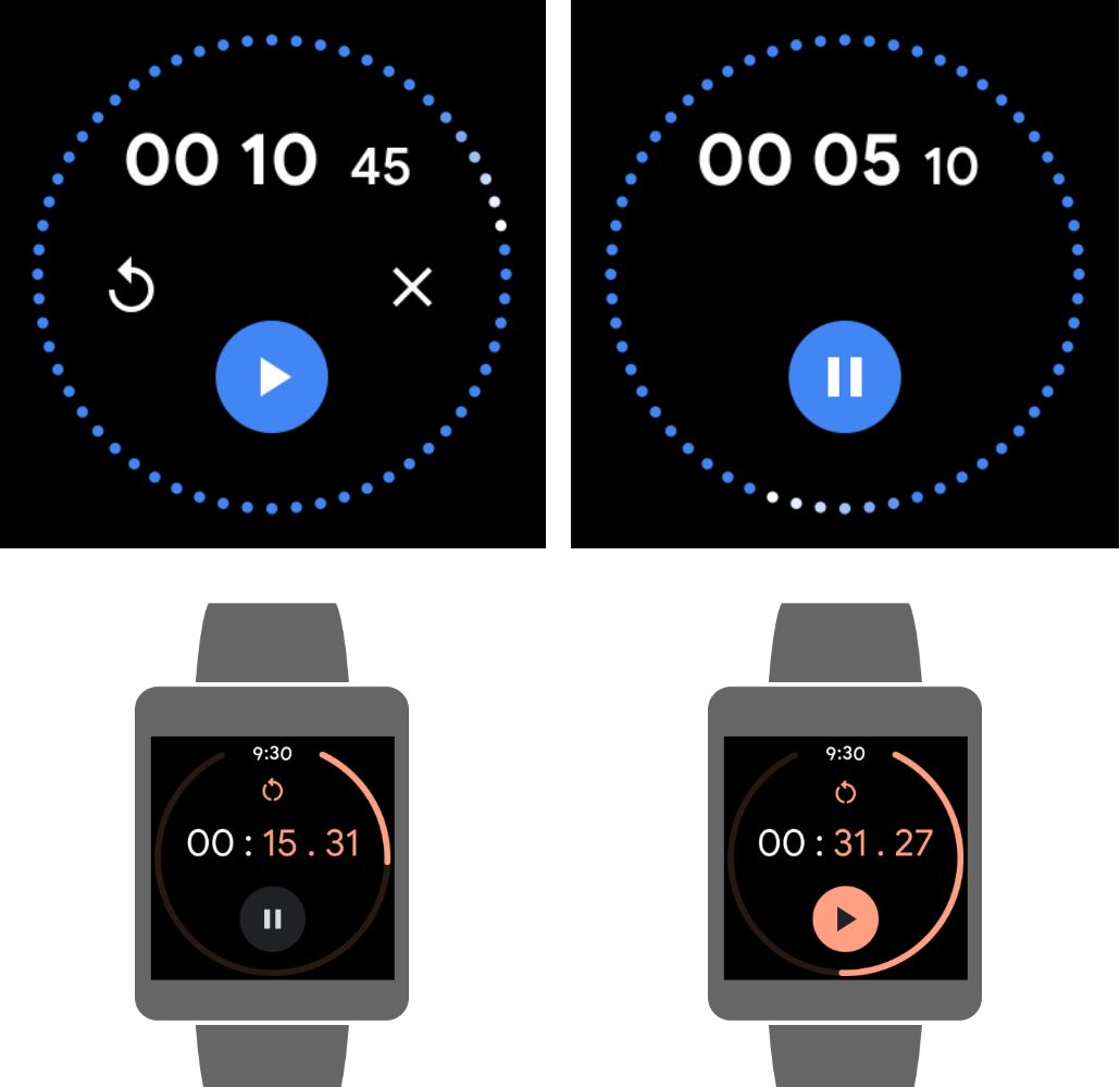 Bei der Auswahl einer Zeitspanne setzt man hingegen wieder auf eine scrollbare bzw. drehbare Ansicht, statt auf den auch vom Smartphone bekannten Kreis. Die Darstellung des Timers und der Stoppuhr wurden ebenfalls überarbeitet und verwenden eine andere Akzentfarbe als bisher. Schaut euch einfach einmal die folgenden Screenshots an. Oben ist die alte bzw. aktuelle Darstellung und darunter die neue Variante.