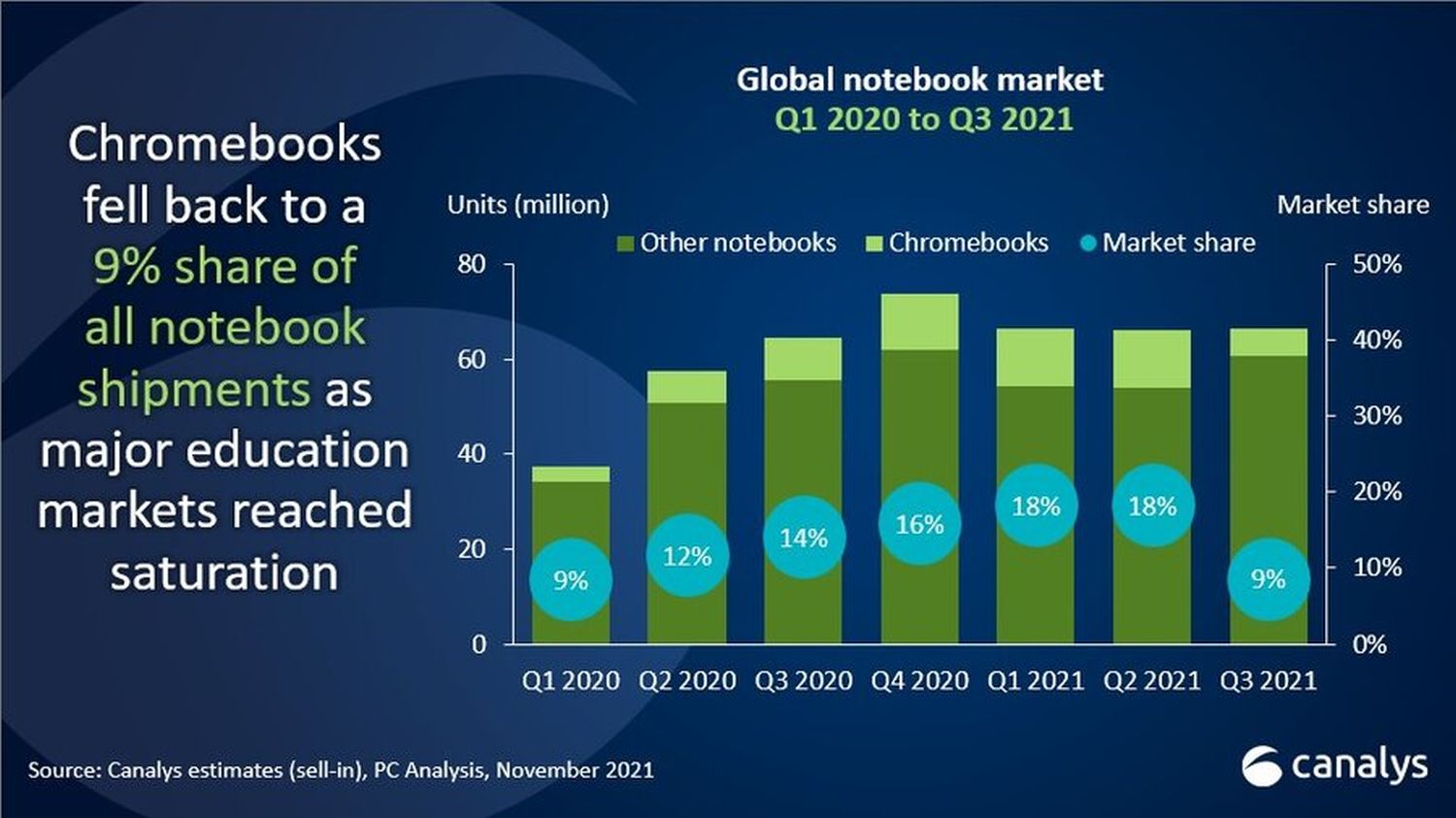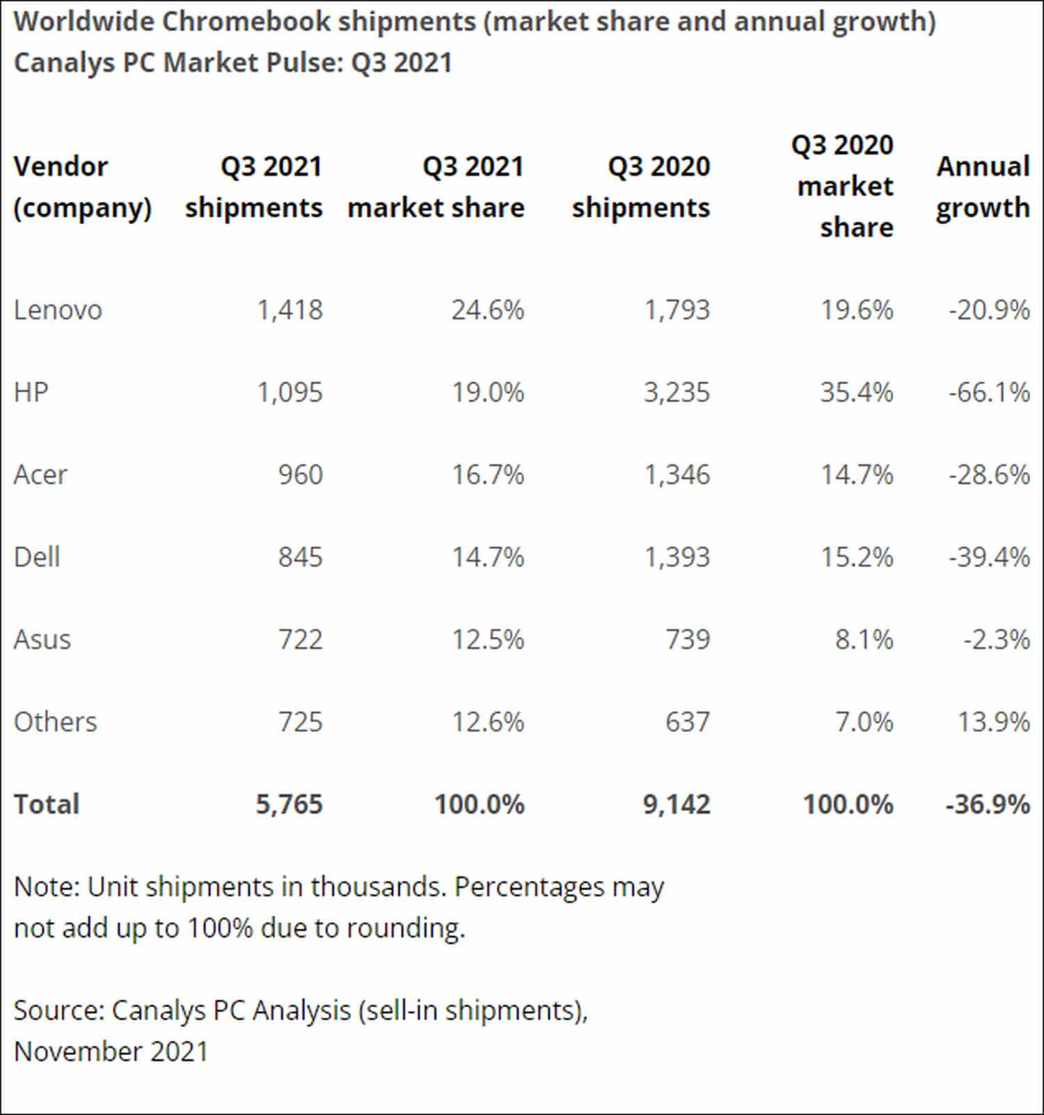Genauso wie die Chromebooks die großen Gewinner der Pandemie waren, sind sie nun die großen Verlierer auf dem normalen Markt – so kann man es sicherlich bewerten. Die Verkaufszahlen gingen im Vergleich zum Vorjahr um 37 Prozent zurück, im Vergleich zum Vorquartal sogar um 52 Prozent. Weil der Gesamtmarkt allerdings gleichzeitig stark gewachsen ist, hat sich der auf das Quartal betrachtete Marktanteil bei den Verkaufszahlen halbiert. Von 18 Prozent im zweiten Quartal auf nur noch 9 Prozent im dritten Quartal.