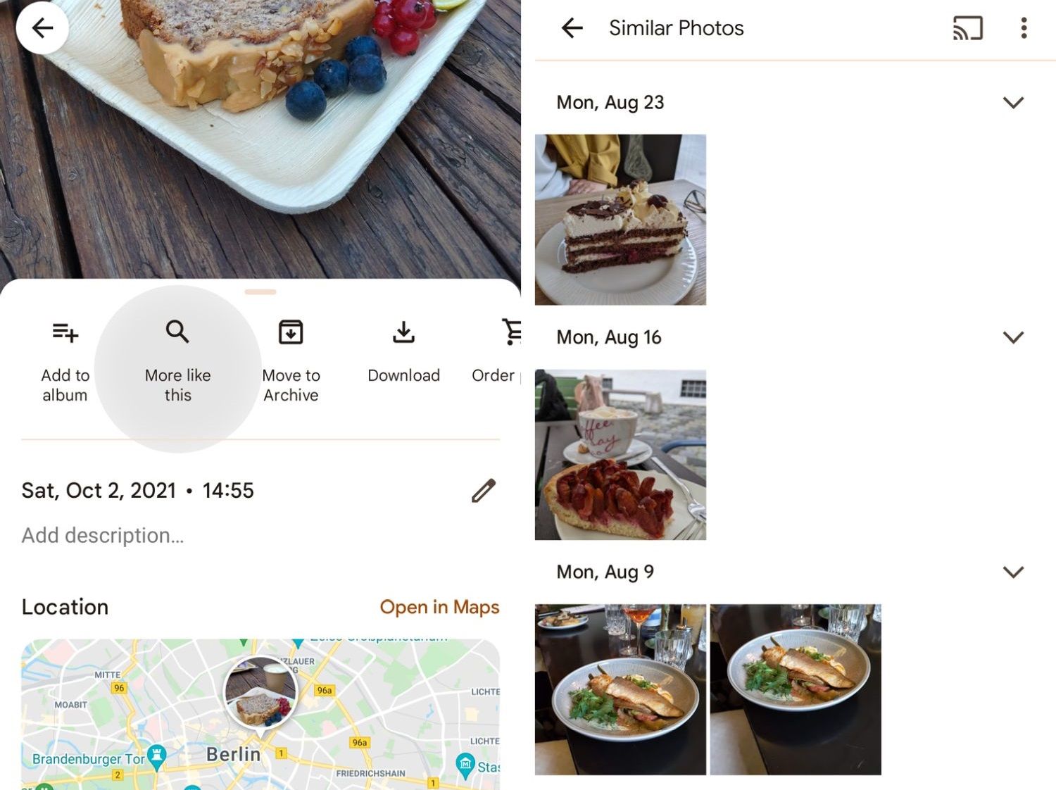 Habt ihr das Update bereits erhalten, das wohl sehr langsam serverseitig ausgerollt wird, wird sich im Kontextmenü bzw. dem nach oben aufschiebbaren Overlay eines jeden Bildes ein neuer Button befinden. Dieser nennt sich in Englisch „more like this“ und listet alle ähnlichen Bilder in der eigenen Datenbank auf. Dabei muss es sich nicht unbedingt um visuell ähnliche Bilder handeln, sondern auch thematisch passende Motive werden aufgelistet. Am obigen Beispiel der Essen-Bilder könnt ihr das sehr gut sehen.