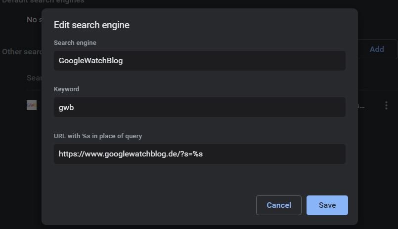 - URL: Die URL der Suchmaschine. Kopiert einfach die URL einer Ergebnisseite und ersetzt das Suchwort durch %s. Beispiel: https://www.googlewatchblog.de/?s=%s