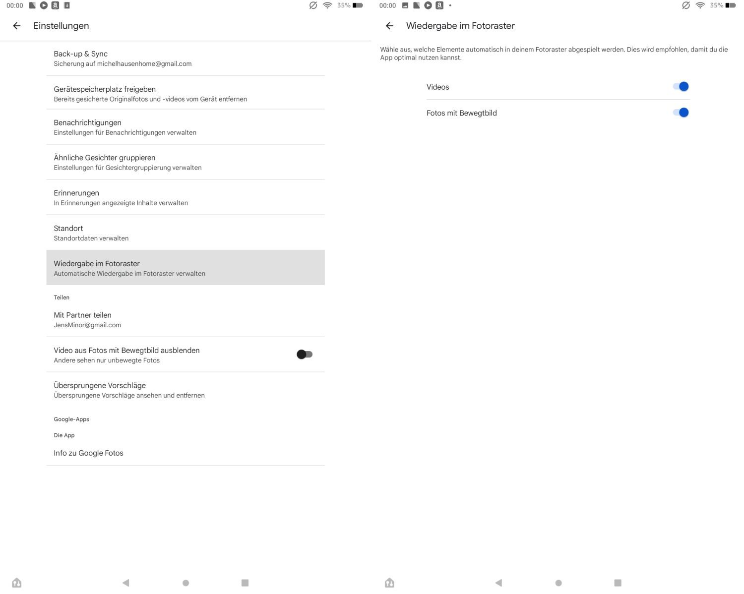 Öffnet einfach die Google Fotos-Einstellungen in der Android-App und sucht dort nach dem Punkt „Wiedergabe im Fotoraster“. Im Untermenü lässt sich auswählen, ob das automatische Playback für Videos oder Fotos mit Bewegtbild aktiviert oder deaktiviert sein soll. Google Fotos empfiehlt, dass beide Optionen aktiviert bleiben, um die App optimal nutzen zu können. Ihr könnt es aber für beide Kategorien selbst festlegen. Ich denke, dass das Deaktivieren für Videos und Aktivieren für Motion Photos die beste Variante ist.