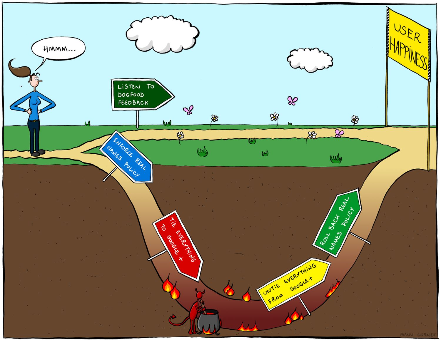 Später wird das immer dramatischer und die kleinen Spitzen werden zu echten Seitenhieben und großer Kritik gegen den Konzern und dessen Mission. Interessanterweise spielen dabei die gleichen Themen eine Rolle, die auch bei Nutzern nicht gut ankommen: Einstellungen, Umbenennungen, ständige Umbauten, zwanghaft überarbeitete Oberflächen oder auch zum Teil politische und ethische Themen. Hier eine kurze Auswahl meiner Favoriten.