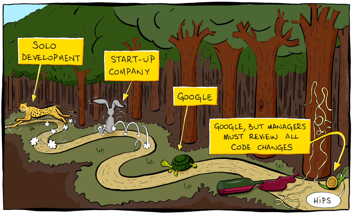 Der ehemaliger Google-Entwickler Manu Cornet betätigt sich nebenbei als leidenschaftlicher Comiczeichner und hat seine Zeit bei Google und auch danach mit Hunderten Comics illustriert, die wie ein Tagebuch verstanden werden können. Es beginnt im Jahr 2007 mit sehr sympathischen Themen und der Begeisterung für das Unternehmen und den Produkten. Schon nach etwa zwei Dutzend Bildern merkt man allerdings, dass die Begeisterung ein wenig verflogen ist und der Zeichner nun im Unternehmens-Alltag mit seinen typischen Hürden und Problemen angekommen ist.