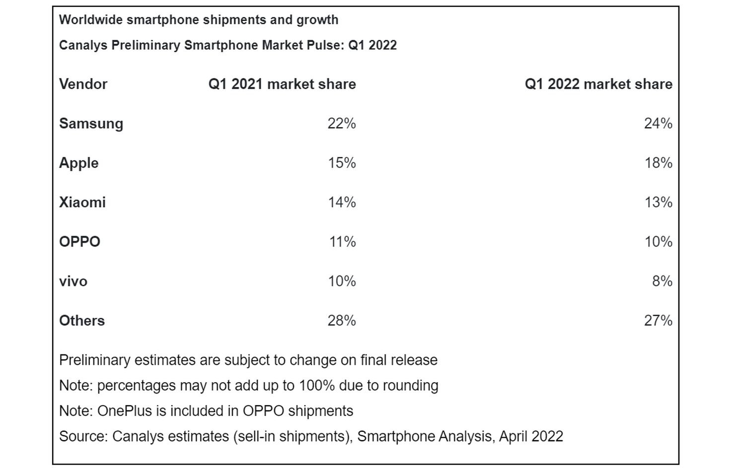 Smartphones: Nutzer kehren zurück zu Samsung und Apple – chinesische Hersteller im Sinkflug (Q1 2022)
