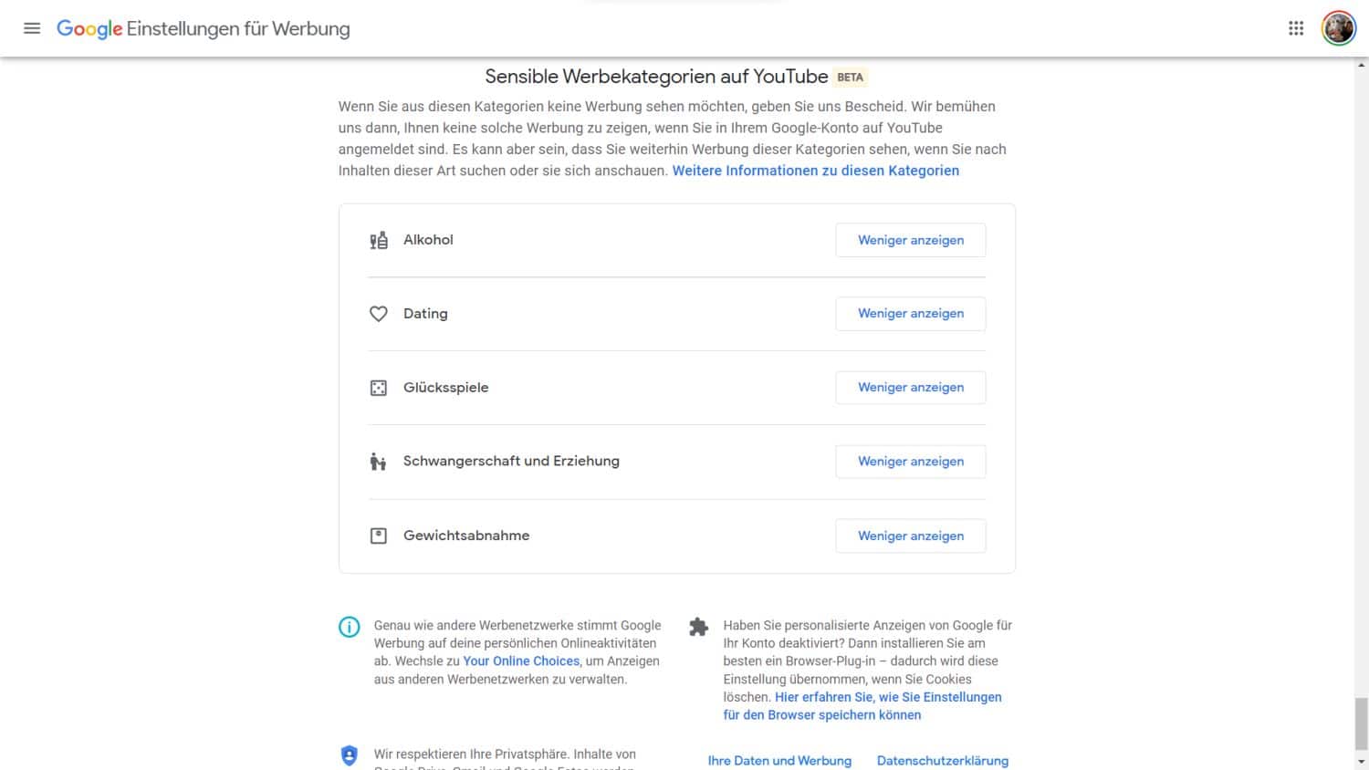 In den Anzeigeeinstellungen könnt ihr euch euer Profil ansehen und von dort einzelne Bereiche entfernen, die euch nicht (mehr) interessieren. Scrollt ihr ganz nach unten, gibt es nun die neue Möglichkeit, einige sensible Bereiche vollständig auszublenden. Für die Kategorien Alkohol, Dating, Glücksspiele, Schwangerschaft und Erziehung & Gewichtsabnahme könnt ihr nun „weniger anzeigen“ auswählen. Google garantiert nicht, dass ihr anschließend keine Werbung mehr aus diesen Bereichen seht, aber es wird sehr stark eingeschränkt sein. Wer das allerdings ausblenden lässt und dennoch verstärkt nach einem dieser Themen sucht, wird weiterhin Anzeigen aus dieser Kategorie sehen.