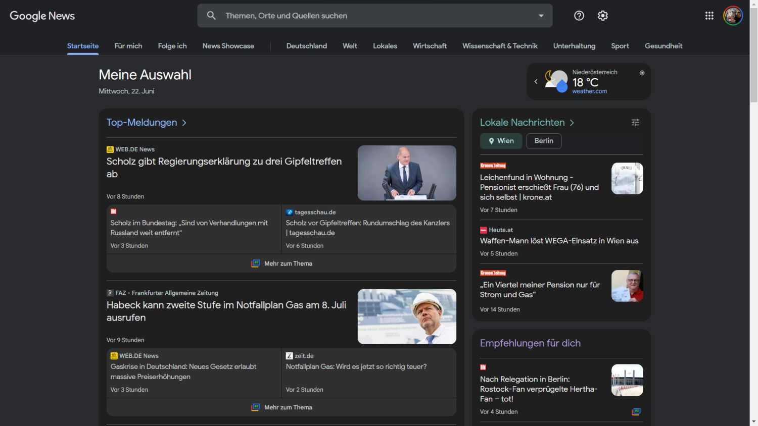 An der Struktur der Hauptseite hat man nichts geändert, denn es gibt weiterhin den großen Hauptstream sowie eine Auflistung ausgesuchter Artikel und auch des Wetters am rechten Rand. Auf den folgenden Screenshots könnt ihr sehen, wie sich das neue Google News präsentiert, das gefühlt sehr viel weniger mit Schlagzeilen und Sammlungen um sich werfen muss.