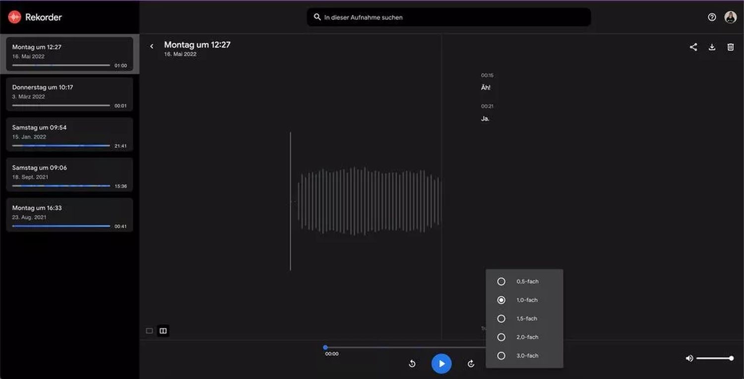 Man muss aber nicht nur den Audiostream hetzen, sondern es geht mit 1,5x auch etwas gemächlicher oder mit 0,5x in halber Geschwindigkeit, um jedes Detail hören zu können. Das kann sicherlich sehr praktisch sein, um viel Zeit zu sparen. Ich persönlich schaue die meisten YouTube-Videos auf 1,25 oder 1,5, um Zeit zu sparen – natürlich abhängig vom Inhalt, der Sprechgeschwindigkeit und ähnlichem. Dass Google Rekorder sogar einen drauflegt, ist da schon überraschend.