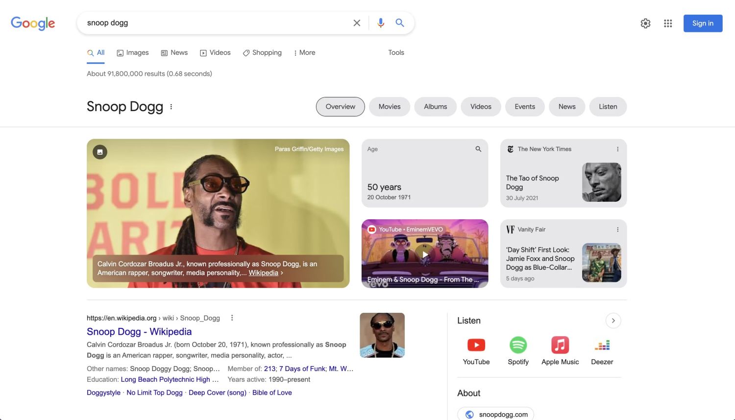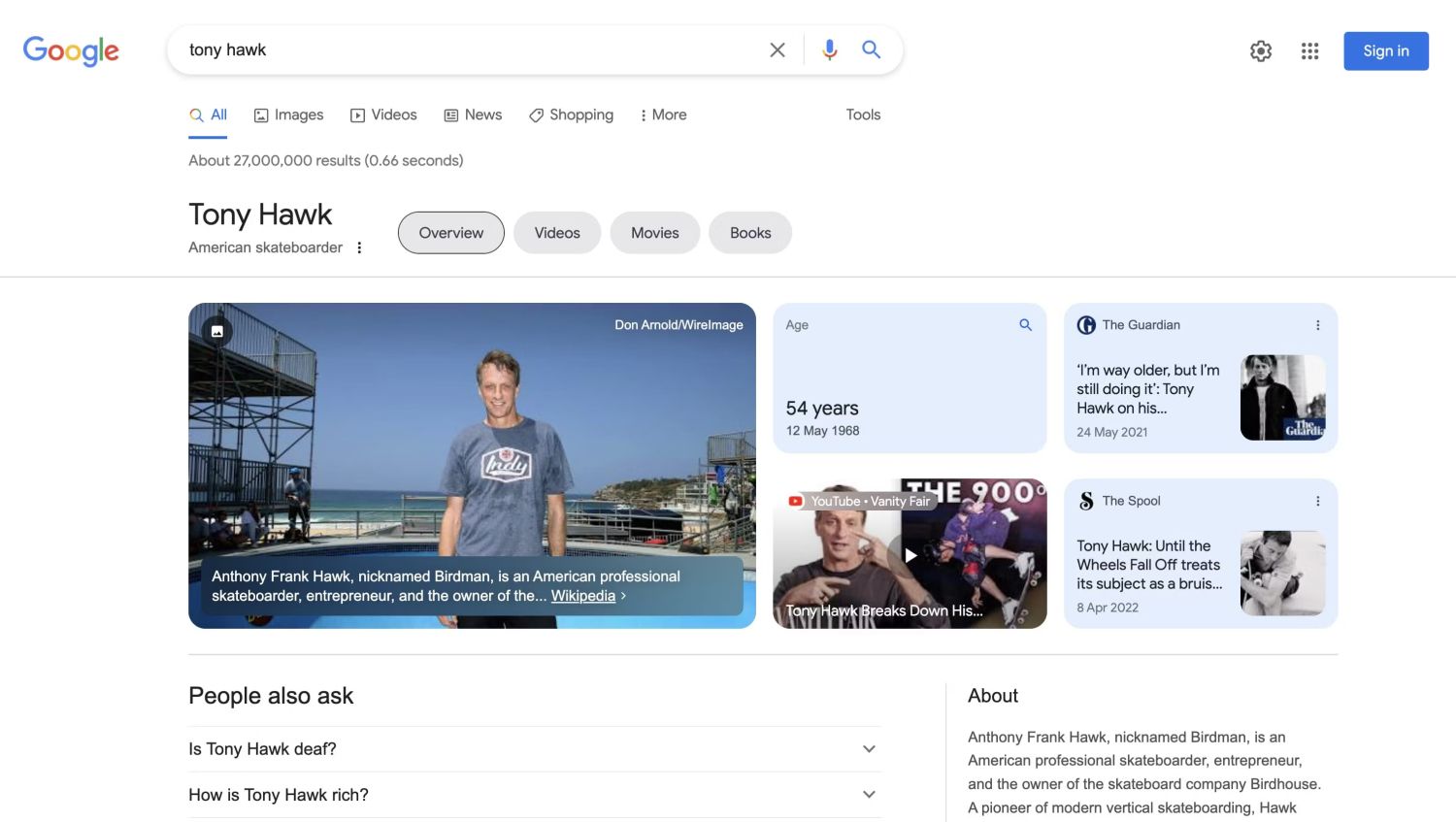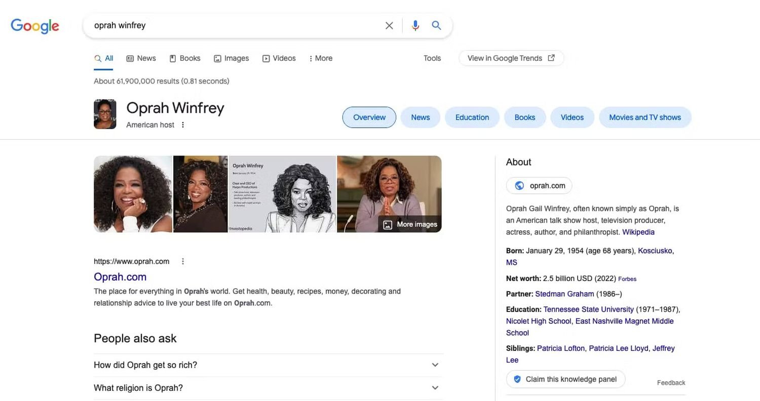Das dürfte jedem bekannt vorkommen. Jetzt testet man eine neue Ansicht (siehe Screenshots unten), die den Bereich am oberen Rand deutlich vergrößert und auf ein großes Vorschaubild in Kombination mit vier kleineren Boxen setzt. Die Inhalte in diesen Boxen können sich unterscheiden und zeigen manchmal wichtige Artikel über diese Person, YouTube-Videos, Fakten wie das Alter oder im Fall von Winfrey den Kontostand und andere Dinge. Der Knowledge Graph bleibt dennoch bestehen und listet die Infos weiter auf, genauso wie die Websuchen-Ergebnisse darunter.