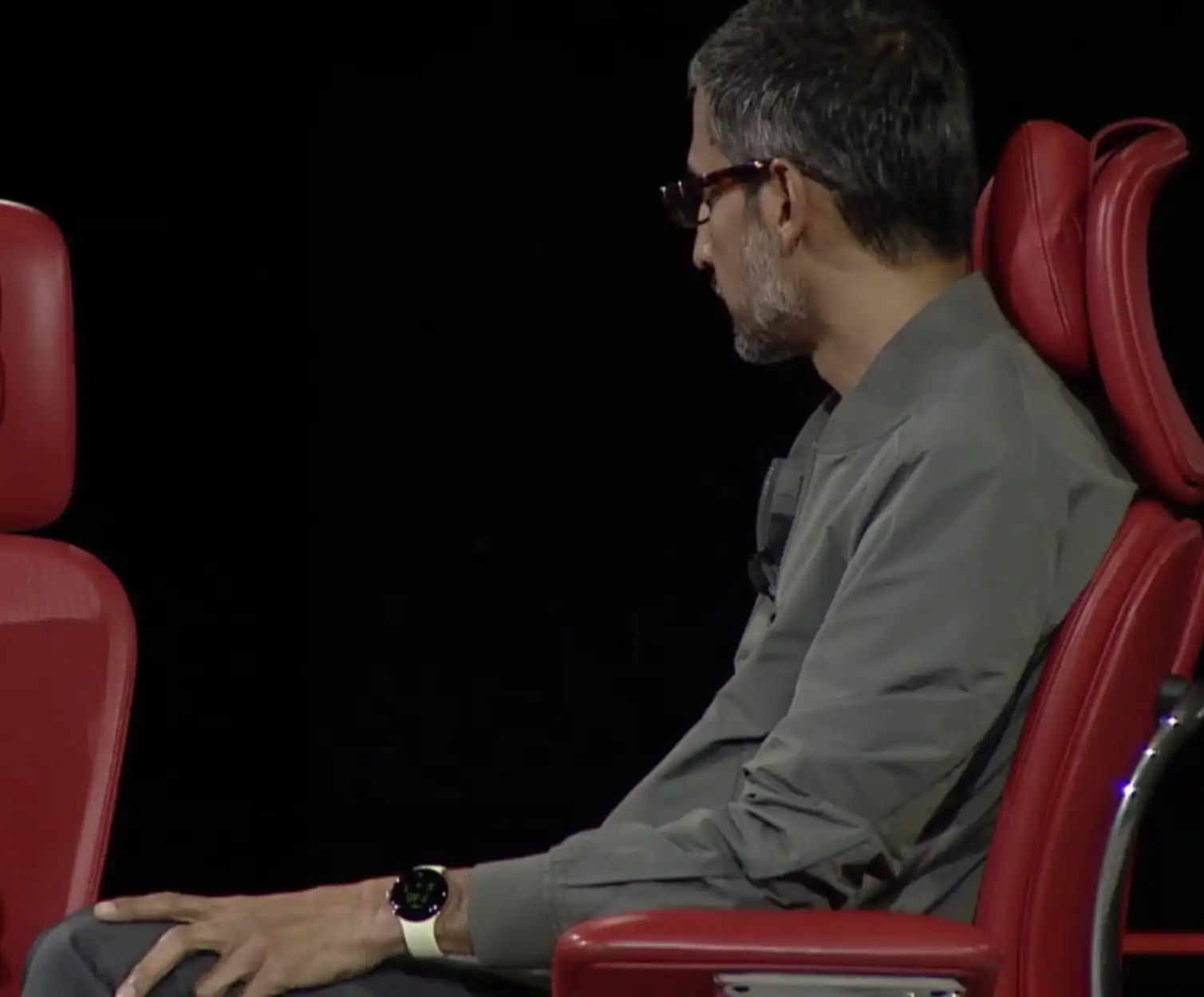 Das Armband der Pixel Watch dürfte nicht ohne Grund gewählt worden sein, denn es sticht hervor und lenkt die Blicke auf die Smartwatch, über die in den letzten Monaten schon so viel gesprochen wurde. Im Gespräch, das sehr breit gefächert war, kam zwar auch die Pixel Watch zur Sprache, aber sie war nicht das Hauptthema. Dass er sie am Handgelenk bereits trug, wurde nicht thematisiert. Leider kann man nicht viel erkennen, sodass die Aufnahmen weit weniger wert sind als Renderbilder.