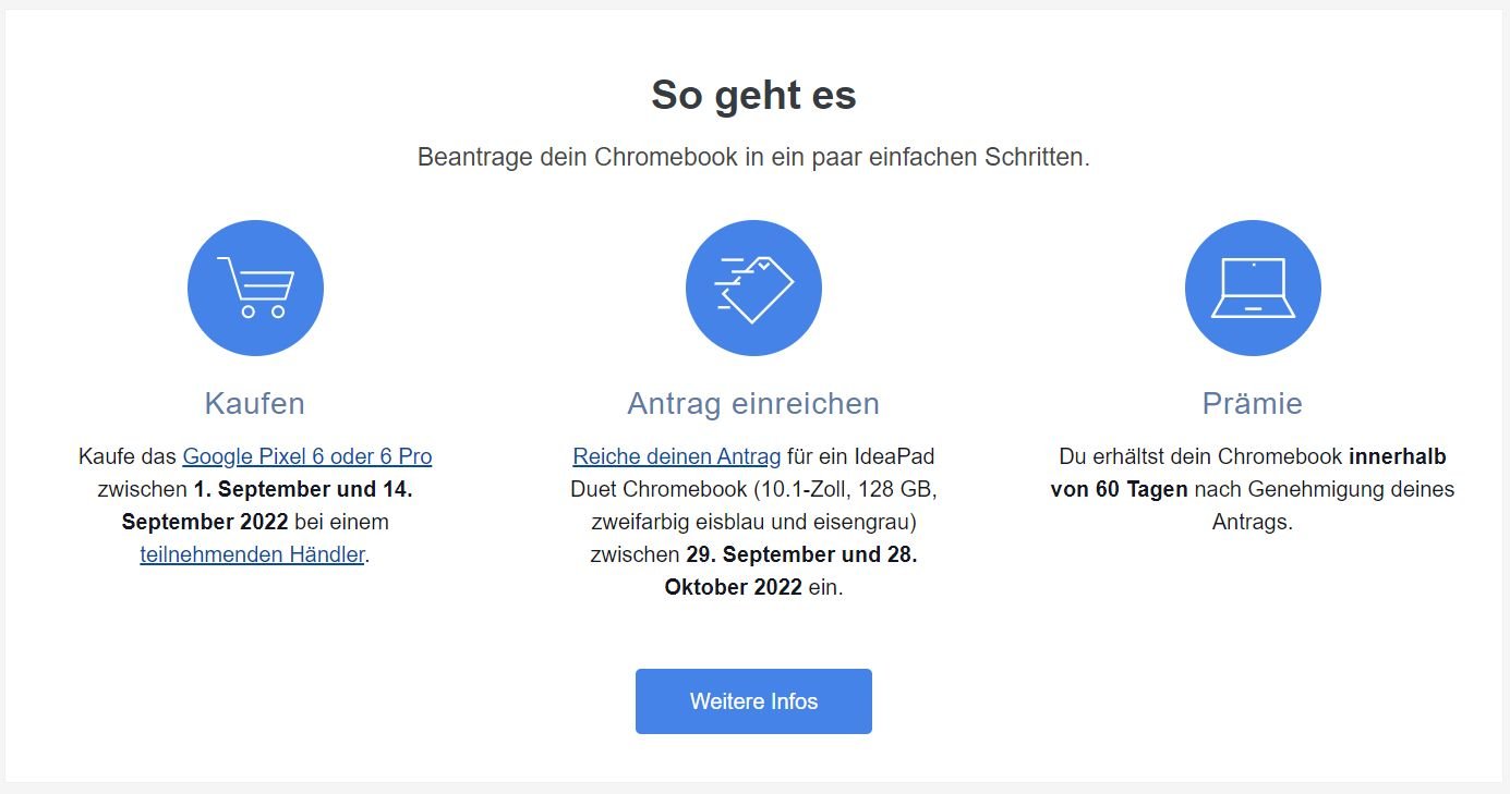 Kauft ihr zwischen dem 1. September und dem 14. September ein Pixel 6 oder Pixel 6 Pro bei einem teilnehmenden Händler (siehe unten), könnt ihr euch anschließend ein Gratis Chromebook holen. Bei dem Chromebook handelt es sich um das Lenovo IdeaPad Duet im Wert von 329 Euro. Beantragen müsst ihr dieses zwischen dem 29. September und 28. Oktober – solltet ihr nicht vergessen und natürlich werden wir euch hier im Blog zu gegebener Zeit noch einmal daran erinnern.