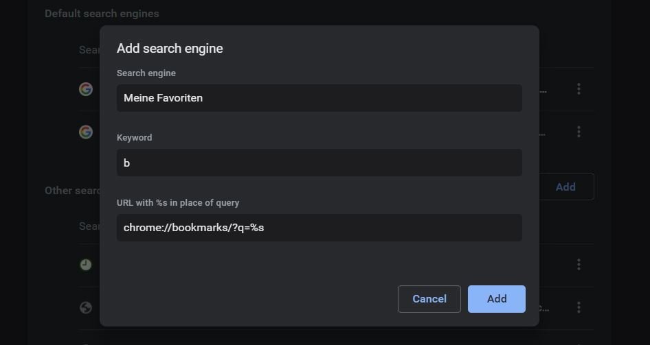 - Fügt diese URL beim Anlegen einer neuen Suchmaschine mit den entsprechenden Anpassungen wieder ein