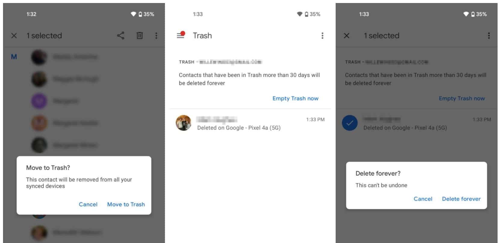 Weil das Löschen eines Kontaktes überraschend schnell von der Hand gehen kann und ohne Warnmeldung auskommt, hat Google dem Produkt schon vor längerer Zeit einen Papierkorb spendiert, in dem die Personen vor der endgültigen Löschung noch einmal aufbewahrt werden. Von dort lassen sich die Personen auch wiederherstellen, sodass eine versehentliche Löschung fast ausgeschlossen ist. Vorausgesetzt allerdings, dass man den Fehler früh genug bemerkt, denn nach 30 Tagen Aufbewahrung wird es endgültig aus dem Papierkorb gelöscht.