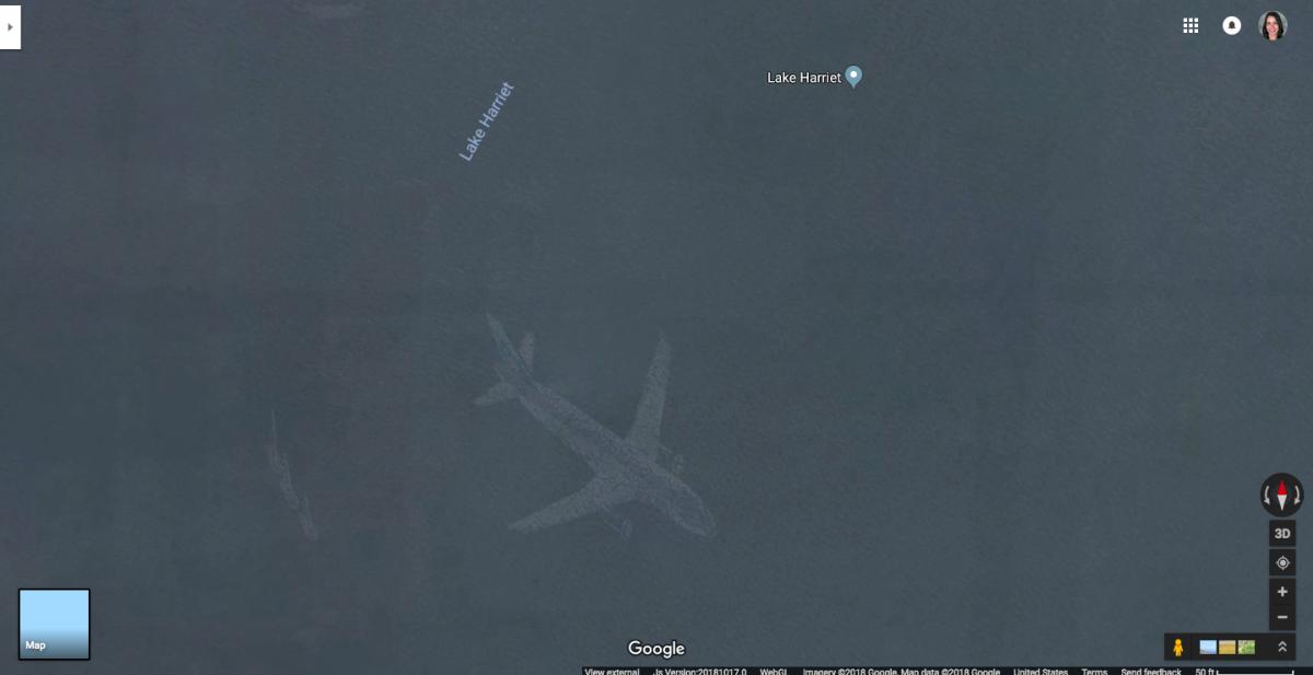 Immer wieder tauchen Flugzeuge in Google Maps auf, aber in diesem Fall wirkt es tatsächlich so, als sei das Flugzeug vollständig im See versunken ist. Das erklärt sich dadurch, dass die Satellitenaufnahmen stets aus mehreren Layern zusammengebaut werden, wobei sehr schnelle Objekte dann möglicherweise nur auf einem Foto sichtbar sind und blass erscheinen.