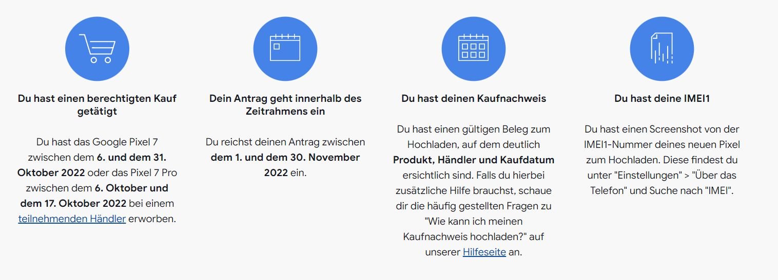 Teilnehmen könnt ihr nur, wenn ihr das Pixel 7 zwischen dem 6. und 31. Oktober oder das Pixel 7 Pro zwischen dem 6. und 17. Oktober gekauft habt. Pixel 7-Käufer sind also alle dabei, habt ihr hingegen das Pixel 7 Pro nach dem 17. Oktober gekauft, habt ihr das Geschenk leider verpasst. Erfüllt ihr dies, müsst ihr bis spätestens bis zum 30. November den Antrag ausfüllen – das ist heute! Dafür benötigt ihr die IMEI des Smartphones sowie die Rechnung / Kaufvertrag.
