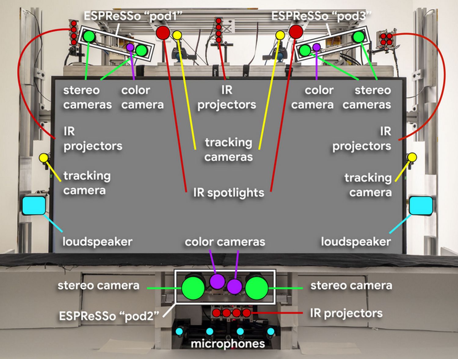 Obige Infografik hat Google veröffentlicht, die zeigt, wie Starline aufgebaut ist und aus wie vielen Kameras, Sensoren, Mikrofonen und Lautsprechern das Produkt besteht.