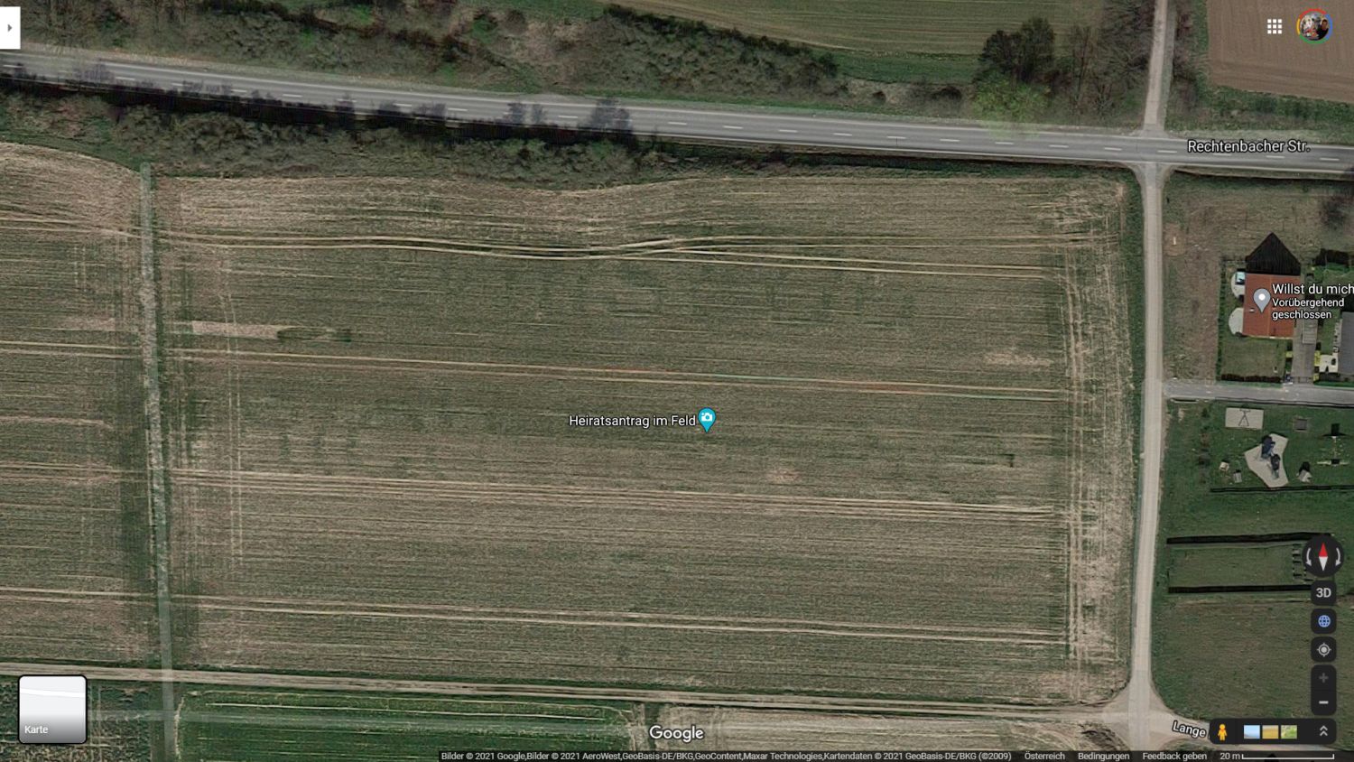 Auf der Kartenplattform Google Maps gibt es immer wieder etwas zu entdecken, manchmal auch nur temporär – aber dafür nicht weniger sehenswert. Vor einiger Zeit hatte sich ein Verliebter etwas ganz Besonderes zum Valentinstag ausgedacht und einen riesigen Heiratsantrag auf einem Feld platziert. Der Heiratsantrag war auf den Satellitenfotos von Google Maps zu sehen und hat weltweit Schlagzeilen gemacht. Heute ist die Botschaft leider nur noch zu erahnen, aber weiterhin eine schöne Geschichte.