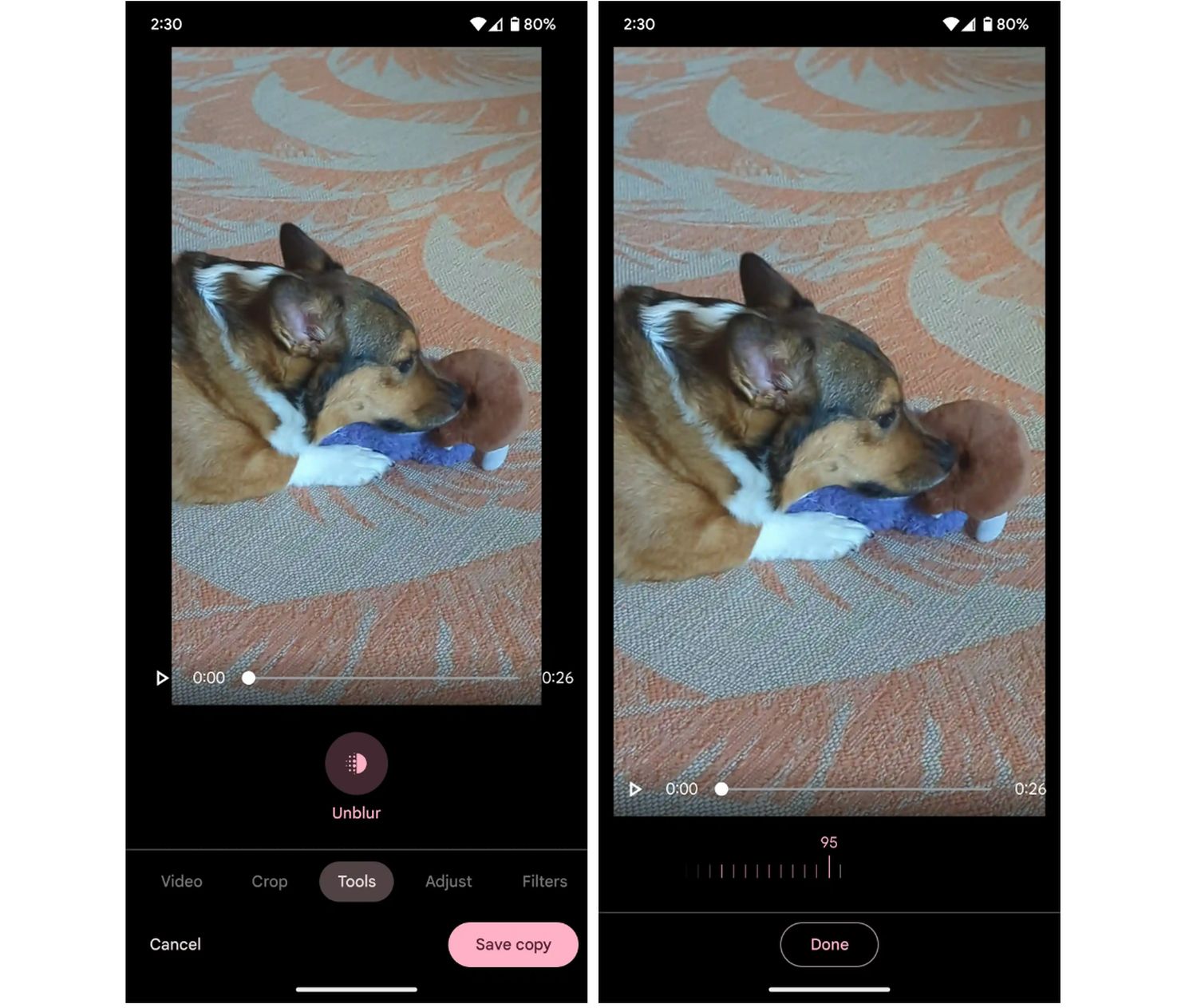 Innerhalb der Google Fotos-App konnte durch Bastelei das neue Feature „Video Unblur“ aktiviert werden. Dieses triggert eine neue Oberfläche für die Schärfe-Einstellung des Videos, hat aber faktisch noch keinen Effekt auf das Video. Es funktioniert also noch nicht und dürfte sich in einem frühen Entwicklungsstadium befinden. Auf folgendem Screenshot könnt ihr es sehen.
