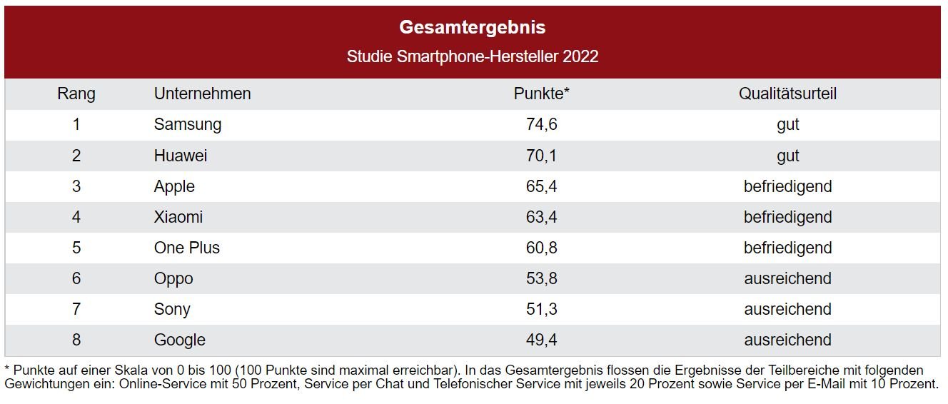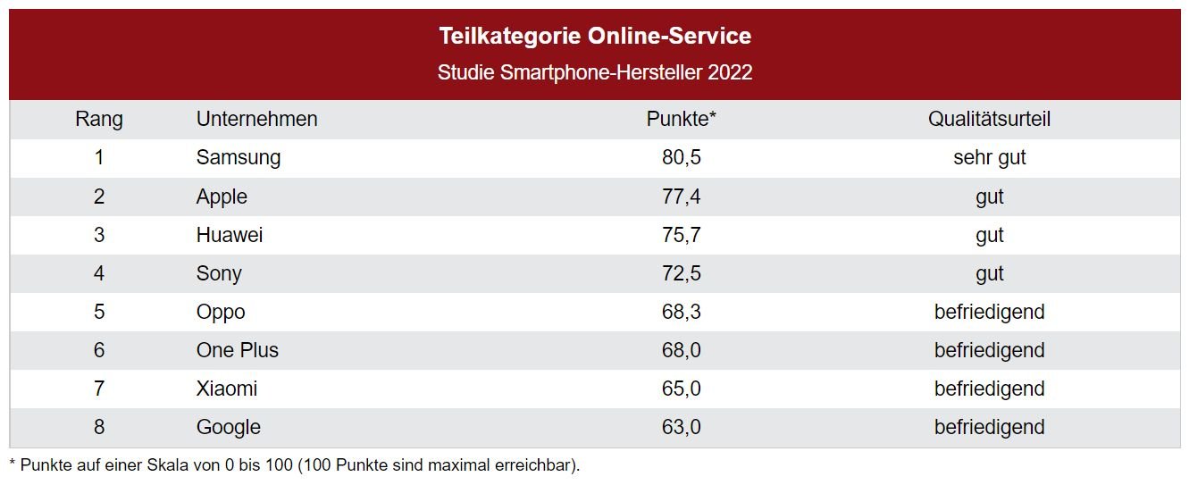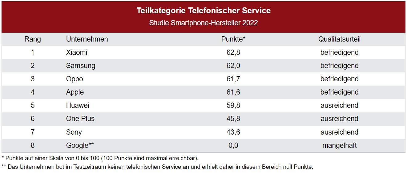 Beim Gesamtranking der Servicequalität erreicht Google 49,4 von 100 Punten. Gewinner Samsung kommt auf 74,6 Punkte. In der Teilkategorie Online-Services – eigentlich Googles Steckenpferd – ist man mit 63 Punkten ebenfalls auf dem letzten Platz. Auch hier gewinnt Samsung und erreicht über 80 Punte. Düster wird es in der Teilkategorie Telefonischer Service, denn dieser ist bei Google schlichtweg nicht existent und erreicht somit nur 0 Punkte. Hier gewinnt überraschenderweise Xiaomi mit knap 63 Punkten.