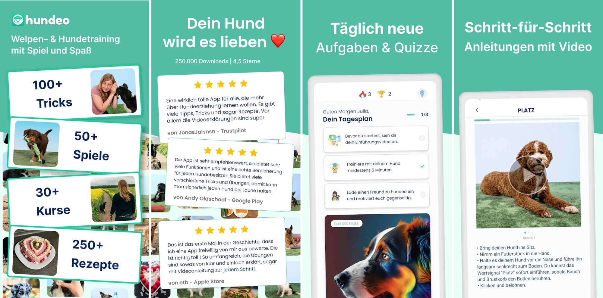 Die Hundeo-App ist eine ganzheitliche Hundetraining-App mit über 300 Tricks, Spielen, Rezepten und Kursen. Die Inhalte sind in einfachen Schritt-für-Schritt-Videoanleitungen unterteilt, die heruntergeladen und offline genutzt werden können. Zusätzlich bietet die App tägliche Inspiration durch Quiz, Spiele, Rezepte und den Kurs des Tages. Hundeo hat es sich zur Aufgabe gemacht, Hundetraining für die Hosentasche zu ermöglichen.