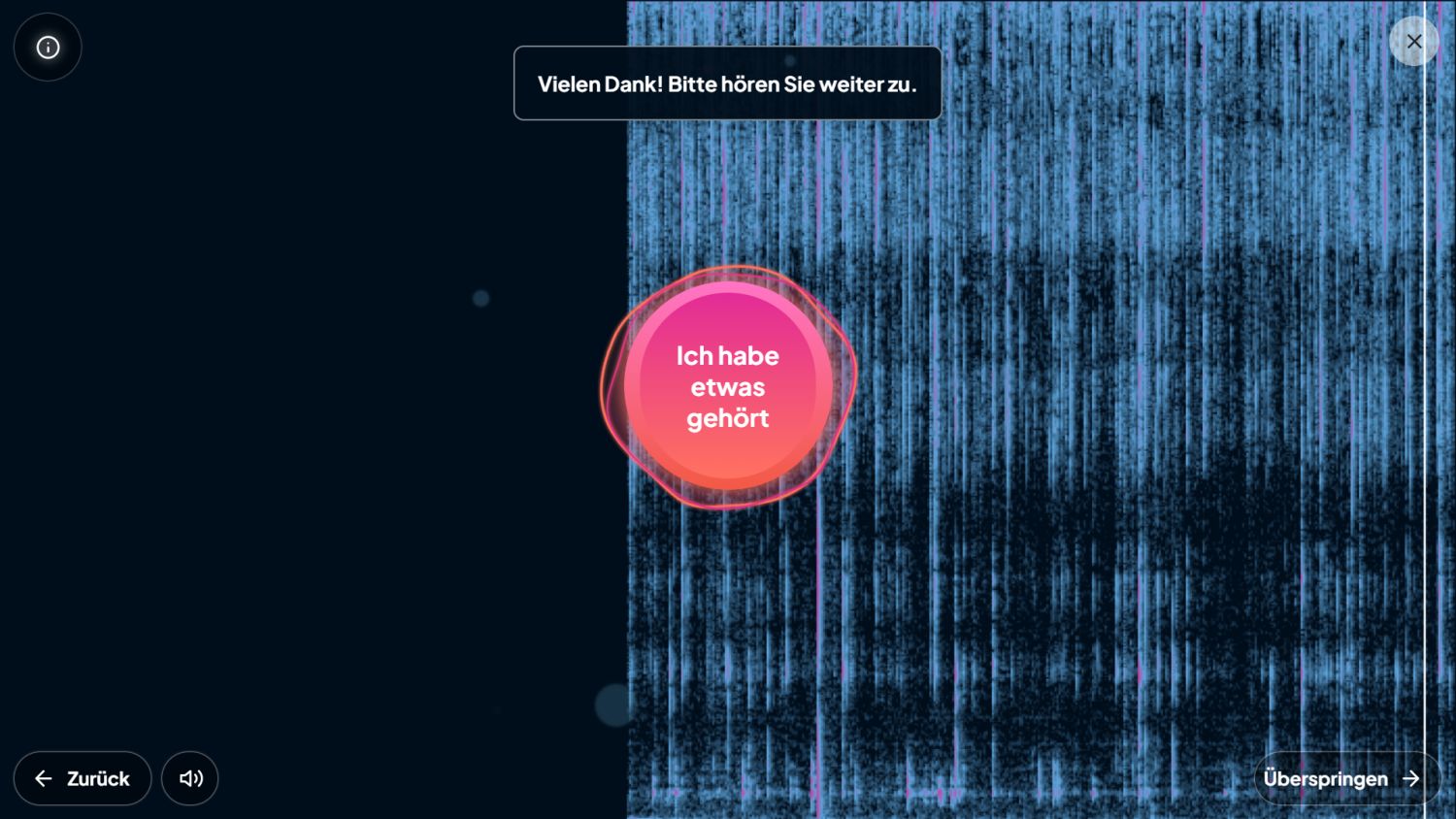 Die Audiodatensätze, die du hören wirst, sind noch nicht von den Wissenschaftlern ausgewertet worden: Während du zuhörst, werden deine wertvollen Klicks auf die Audiodaten als Zeitstempel aufgezeichnet und an die Forscher übermittelt, damit sie herausfinden können, ob es Anzeichen von Lebewesen auf ihren Aufnahmen gibt.Auf diese Weise wird die Gesundheit des Ökosystems überwacht, illegale Fischerei aufgespürt und der Erfolg von Wiederherstellungsmaßnahmen gemessen. Mit Hilfe deiner Klicks werden dann Computer darauf trainiert, Fischgeräusche automatisch zu erkennen, was die Forschungsarbeiten erheblich beschleunigt.