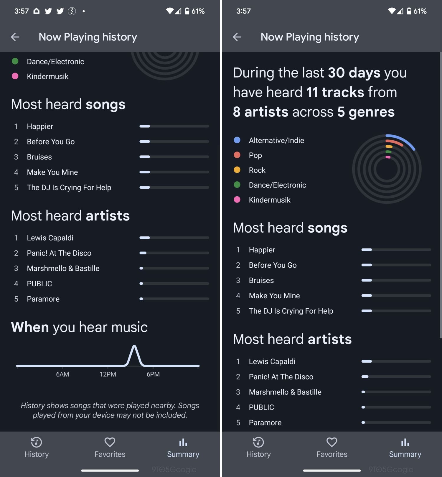 In der Now Playing-App gibt es seit längerer Zeit einen Verlauf der erkannten Songs, sodass man auch rückwirkend einzelne Titel abrufen kann. Außerdem eine Favoritenfunktion sowie die Möglichkeit, den Song direkt auf den großen Streamingdiensten zu hören. Jetzt steht ein großes Update vor der Tür, das eine Zusammenfassung mitbringt und einige Auswertungen im Gepäck hat. So werden die Songs nach Musikrichtung sortiert, es lassen sich die meistgehörten Songs abrufen, die meistgehörten Künstler und sogar eine Statistik, über die Tageszeit der erkannten Songs.