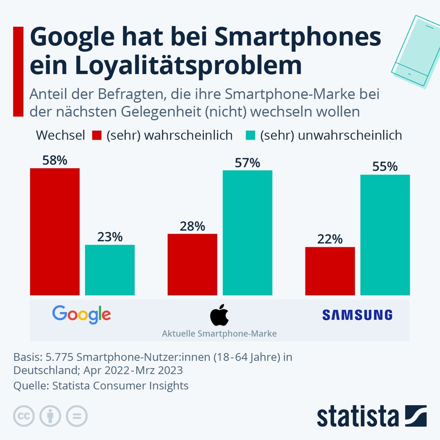 Nur 28 Prozent aller Apple-Nutzer sowie 22 Prozent aller Samsung-Nutzer wollen nach dem Ende der Lebenszeit des aktuellen Geräts zu einer anderen Marke wechseln. Ganze 57 Prozent aller Apple-Nutzer bleiben bei einem Smartphone aus Cupertino und auch 55 Prozent aller Samsung-Nutzer werden beim nächsten Smartphone-Kauf wieder Geld nach Südkorea schicken. Im direkten Vergleich hat Google also noch einiges an Aufholbedarf.
