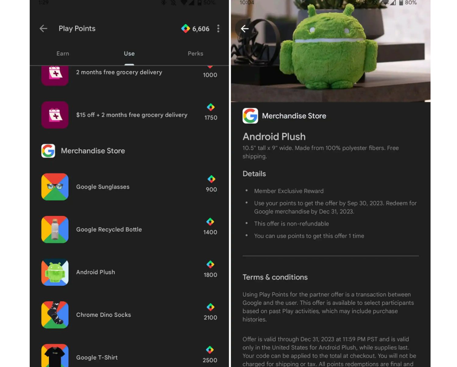 Nutzer können die erworbenen Punkte gegen einige Produkte aus dem Google-Merchandising umtauschen. Dazu gehören seit dem Start der Erweiterung unter anderem T-Shirts, Socken, Sonnenbrillen Trinkflaschen. Ganz neu dazugekommen ist eine Android-Plüschfigur, die ihr auf obigem Screenshot sehen könnt. Laut der Beschreibung ist diese Play Points-exklusiv und wird nicht über den Merchandising Store verkauft. Wirklich groß und hübsch ist die Figur nicht, da gab es schon bessere Bugdroids, aber dennoch für Android-Fans sicherlich etwas, das man mal mitnehmen kann, bevor die Punkte verfallen.