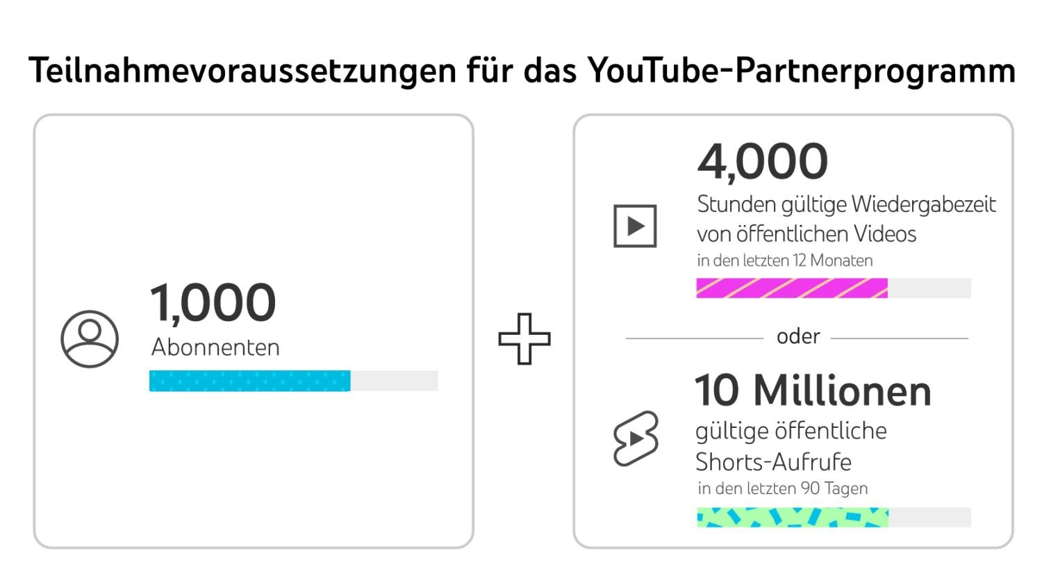 Habt ihr die grundsätzlichen Voraussetzungen erfüllt, müsst ihr zur Teilnahme auch schon einen gewissen Erfolg vorweisen können. Ihr könnt also nicht das erste Video auf eurem jungfräulichen Kanal monetarisieren. Wenn ihr keiner Zuschauer habt, würdet ihr dadurch ohnehin nichts verdienen. Ihr müsst bereits 1.000 Abonnenten haben und mindestens 4.000 Stunden Videowiedergabe in den letzten 12 Monaten vorweisen können. Alternativ 10 Millionen Aufrufe von YouTube Shorts in den letzten 90 Tagen. Diese Voraussetzungen müsst ihr aber nicht nur einmalig, sondern dauerhaft erreichen.