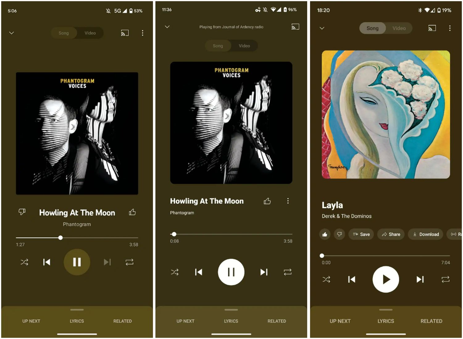 Auf dem linken Screenshot seht ihr die aktuelle Oberfläche, in der Mitte einen Testlauf vom Januar und auf der rechten Seite den aktuellen Test. Im Rahmen dieses Tests wird ein Karussell über die Player-Buttons und die Fortschrittsleiste gebracht, das die wichtigsten Interaktionsmöglichkeiten anbietet: Like, Dislike, in einer Playlist speichern, Teilen, Herunterladen oder auch das Starten eines Radio-Programms auf Basis des aktuellen Titels.