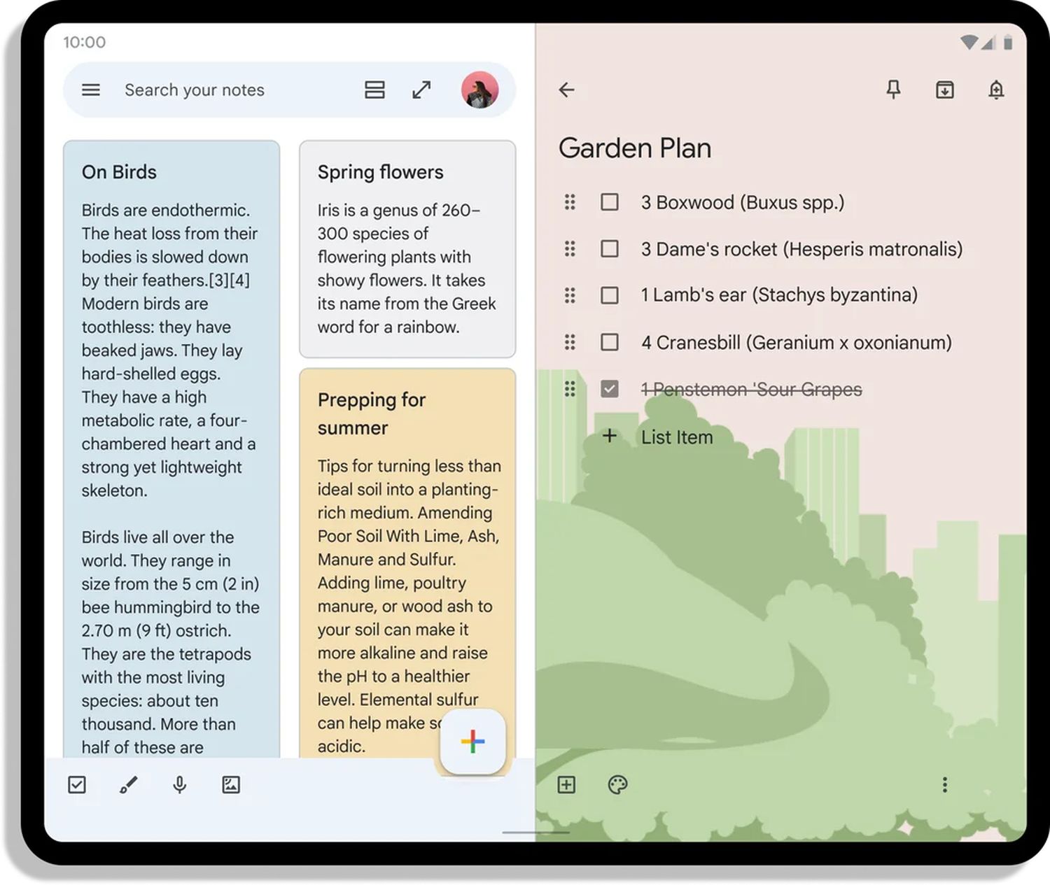 Wenn Sie Ihr faltbares Telefon öffnen und Google Keep verwenden , wechselt die App zu einem Layout mit zwei Fenstern. Auf dem größeren Bildschirm können Sie alle Ihre Notizen ganz einfach auf einen Blick sehen, den linken Bereich schnell durchsuchen, um die benötigte Notiz zu finden, und sie dann auf der rechten Seite bearbeiten.