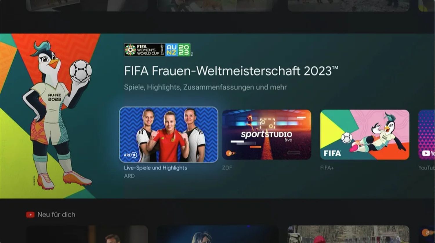 Google TV ist die Anlaufstelle für Fans der FIFA Frauen-Weltmeisterschaft™, um Live-Spiele, Highlights, Dokus und mehr zu sehen. Wählt aus einer Vielzahl von Anbietern wie YouTube und FIFA+ sowie Sender wie ARD und ZDF aus, um immer auf dem neuesten Stand zu sein. Seit dem 20. Juli findet ihr auf eurem Startbildschirm eine neue Rubrik, mit der ihr schnell zu den Inhalten springen könnt, die euch gerade interessieren. So könnt ihr das Beste aus eurem Google TV-Erlebnis machen und das Turnier in vollen Zügen genießen.