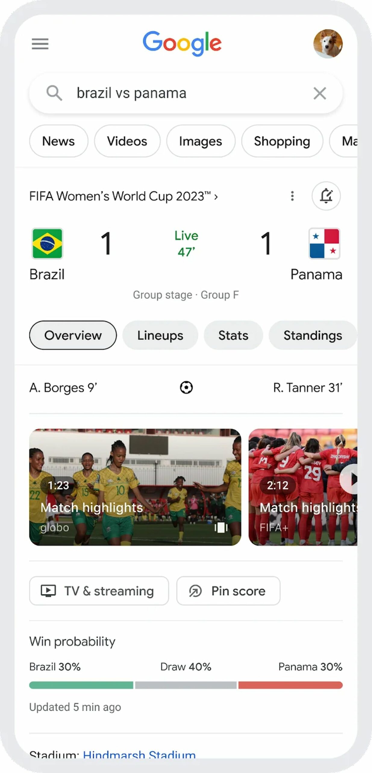 Wenn ihr während der FIFA Frauen-Weltmeisterschaft™ nach dem Turnier selbst, einem bestimmten Spiel, einem Team oder einer Spielerin sucht, verpasst ihr keinen wichtigen Moment. Ihr könnt euch offizielle Highlights und Zusammenfassungen ansehen, euren Lieblingsteams folgen, euch während der Spiele benachrichtigen lassen – und Statistiken zu bisherigen Aufeinandertreffen, aktuelle Form und Siegwahrscheinlichkeit abrufen.