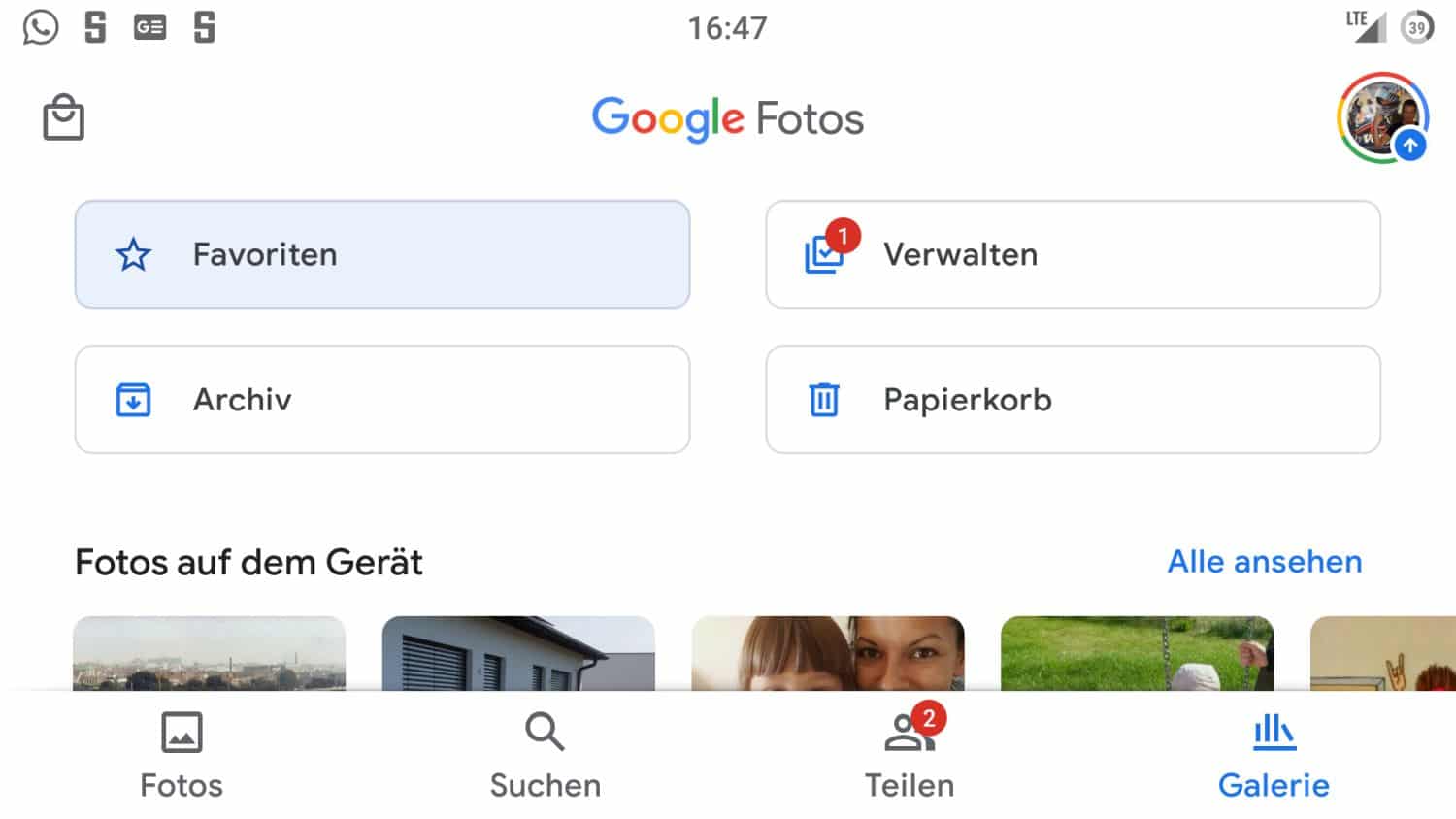 Auf dem Smartphone müsst ihr leider etwas länger suchen, um die Favoriten zu finden: Ihr müsst in der unteren Hauptnavigation den Punkt „Galerie“ auswählen und dort findet ihr über der Alben-Liste den Eintrag „Favoriten“. Es hätte sich sicherlich angeboten, auch unter Android ein längeres Menü oder das Hamburger-Menü zu verwenden, sodass die Favoriten und andere wichtige Bereiche dauerhaft schnell gefunden werden können.