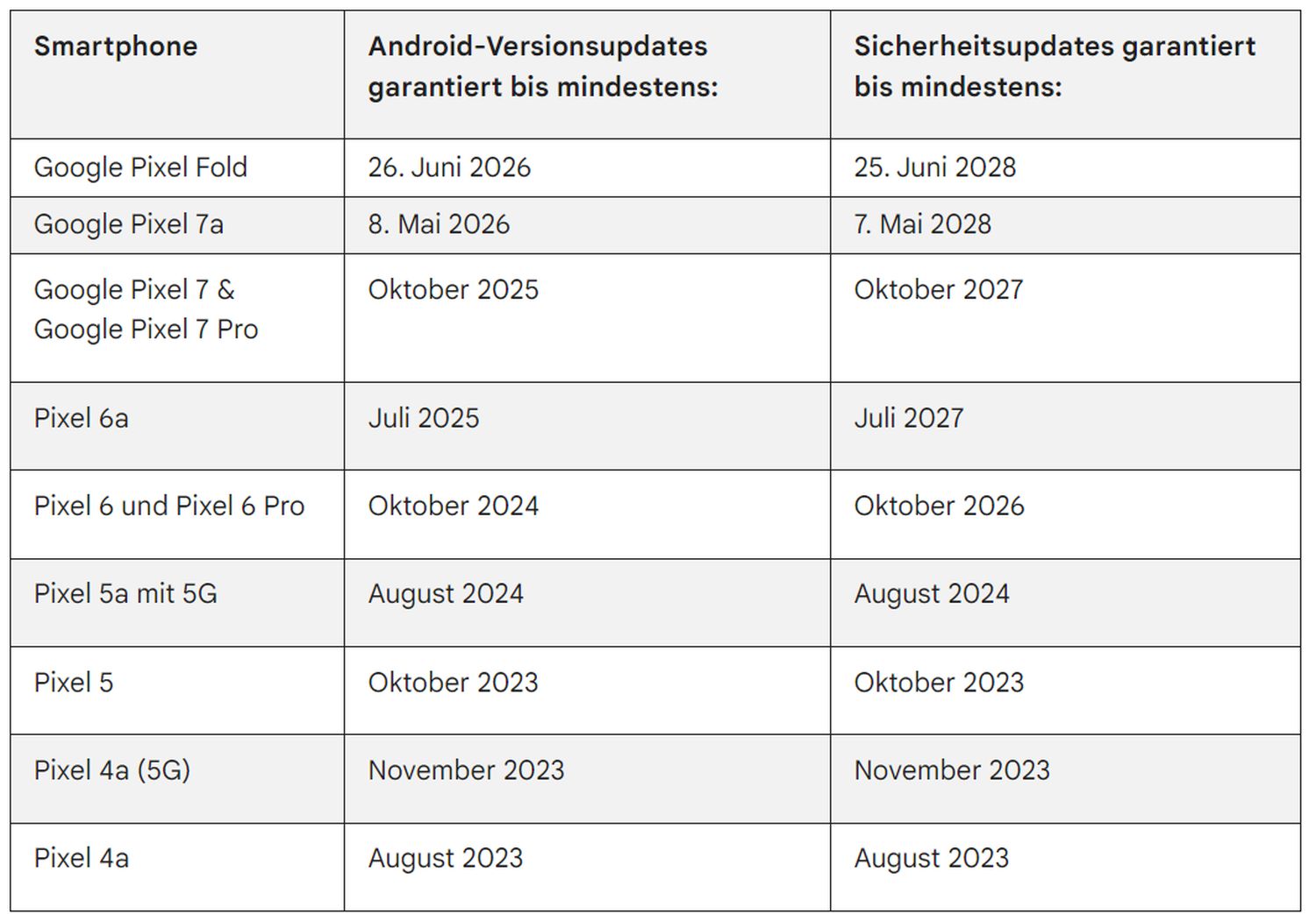Das Budget-Smartphones erhält ebenfalls eine sehr exakte Zeitangabe und bezieht sich nicht mehr auf einen Monat – was beim Pixel 4a für „Ärger“ gesorgt hat – sondern auf ein konkretes Datum. Am 8. Mai 2026 ist Schluss mit Android-Updates und kurz vor dem 7. Mai 2028 gibt es das letzte Mal ein Sicherheitsupdate. Läuft alles weiter nach Plan, gibt es zum Ende der funktionellen Updates das Pixel 10a und zum Ende der Sicherheitsupdates das Pixel 12a.