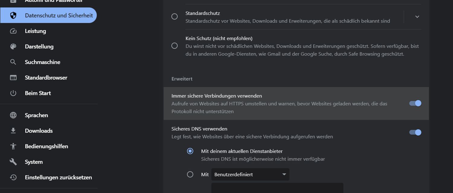 - Sucht dort den Eintrag „Immer sichere Verbindung verwenden“ und aktiviert diesen
