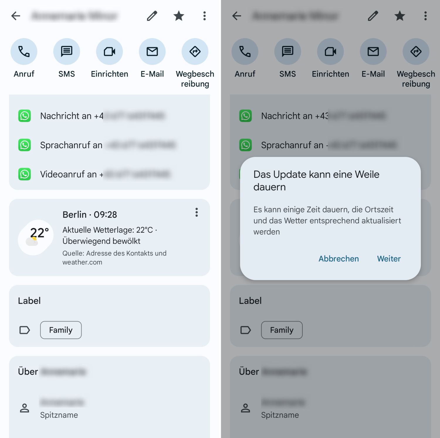 Google Kontakte: Neue Infokarte zeigt die lokale Uhrzeit und das Wetter am Wohnort der Person (Screenshots)