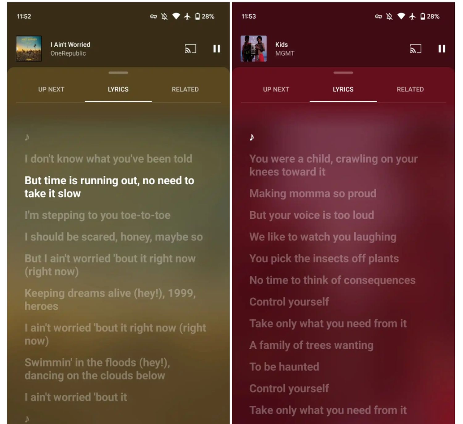 Schon seit längerer Zeit zeichnet sich ab, dass man diesen Bereich deutlich überarbeiten wird und nicht mehr nur die rohen Texte anzeigen möchte. Stattdessen sollen diese Live-Scrolling erhalten und die jeweils aktuelle Zeile des Songs deutlich hervorheben. Man könnte es als Karaoke-Funktion bezeichnen, denn mit dieser wird es für Nutzer einfacher, mitzusingen oder zumindest mitzulesen und die jeweiligen Stellen deutlicher zu verstehen. Ein kleines Highlight: Das Antippen einer Textstelle springt zu dieser Stelle im Song. Hat man in der Form auch noch nicht so häufig gesehen.