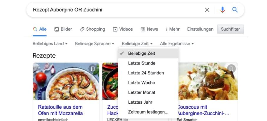 Mit der Funktion (OR) können mehrere Suchbegriffe kombiniert werden. Verwendet ihr diese Funktion in der Google Suche zwischen zwei Begriffen, erhaltet ihr Suchergebnisse, die entweder einen oder alle Suchbegriffe enthalten. Beispiel: Rezept Aubergine OR Zucchini