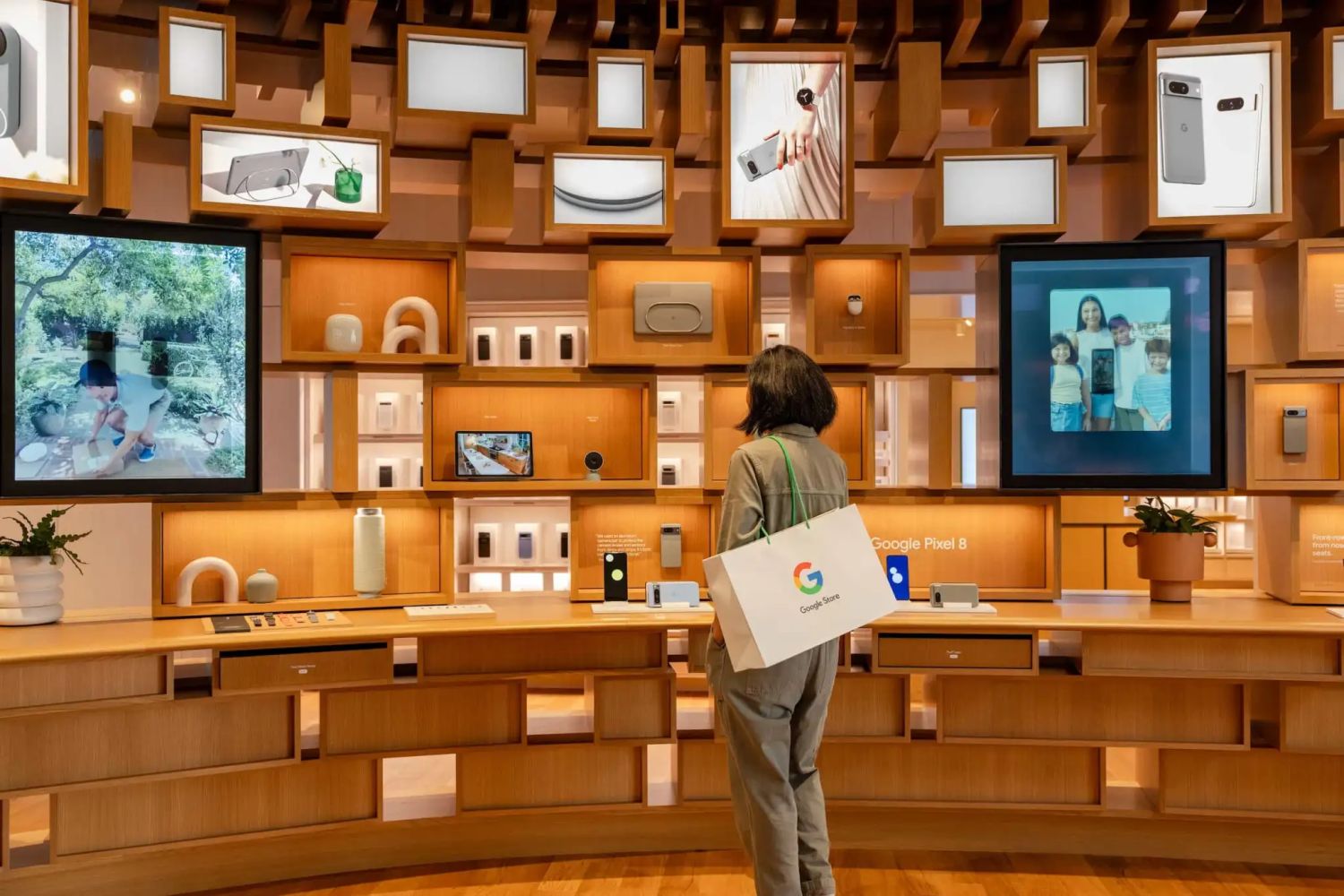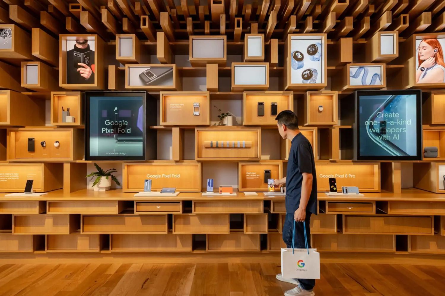 Der neue Store teilt sich in ein klassisches Geschäft, eine Art Erlebniswelt, eine Cafeteria sowie in Veranstaltungsflächen auf und hat somit eine beträchtliche Größe. Der gesamte Store wird von Holz dominiert und die Geschäftsfläche ist laut Pressemitteilung als lange „Wunderkammer „aufgebaut, in der Produkte präsentiert werden. Es gibt auch einen Kinderbereich mit Musikerlebnissen, die auf einem Pixel Tablet genutzt werden. Auch das klassische Google-Merchandising ist hier zu haben.