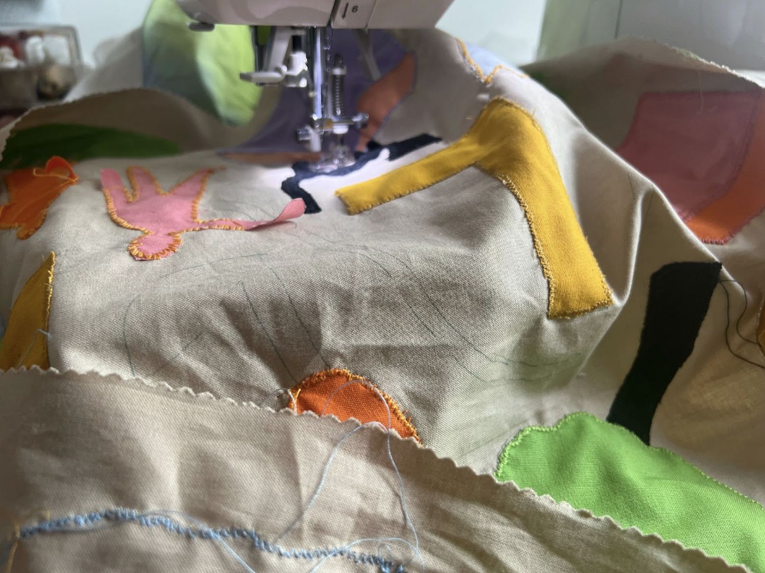Auf der Steppdecke findet sich eine Reihe von Motiven, wobei allerdings das große Ganze die wichtigste Rolle spielt: Die Decke ist optisch in zwei Teile geteilt, die miteinander zusammengeflickt wurden. Auf beiden Seiten wird daran gearbeitet, den Riss zusammenzuflicken. Meiner Meinung nach hat man es sehr gut dargestellt, dass man zwar gemeinsam daran arbeitet und viele Zwischenschritte getan hat (die einzelnen Verbindungsstücke), aber den Prozess längst noch nicht abgeschlossen hat. Die beiden Deckenseiten zeigen natürlich Ost und West.